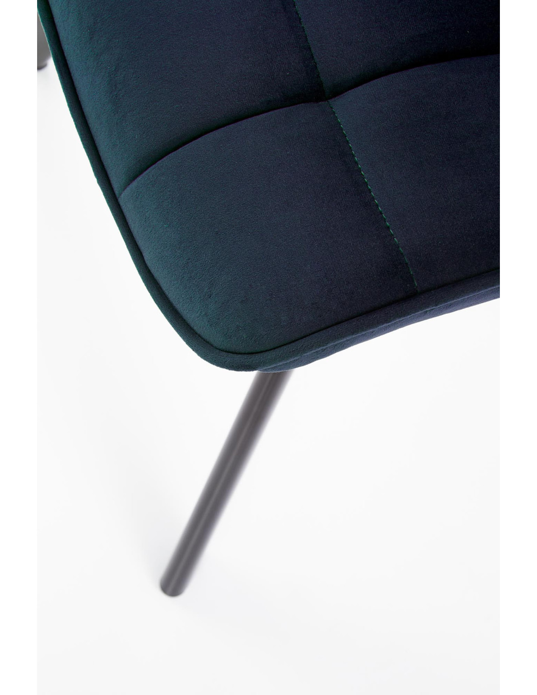Krzesło wyróżnia się pikowaną tapicerką, ergonomicznie wyprofilowanym oparciem oraz stabilną konstrukcją na metalowych nogach.