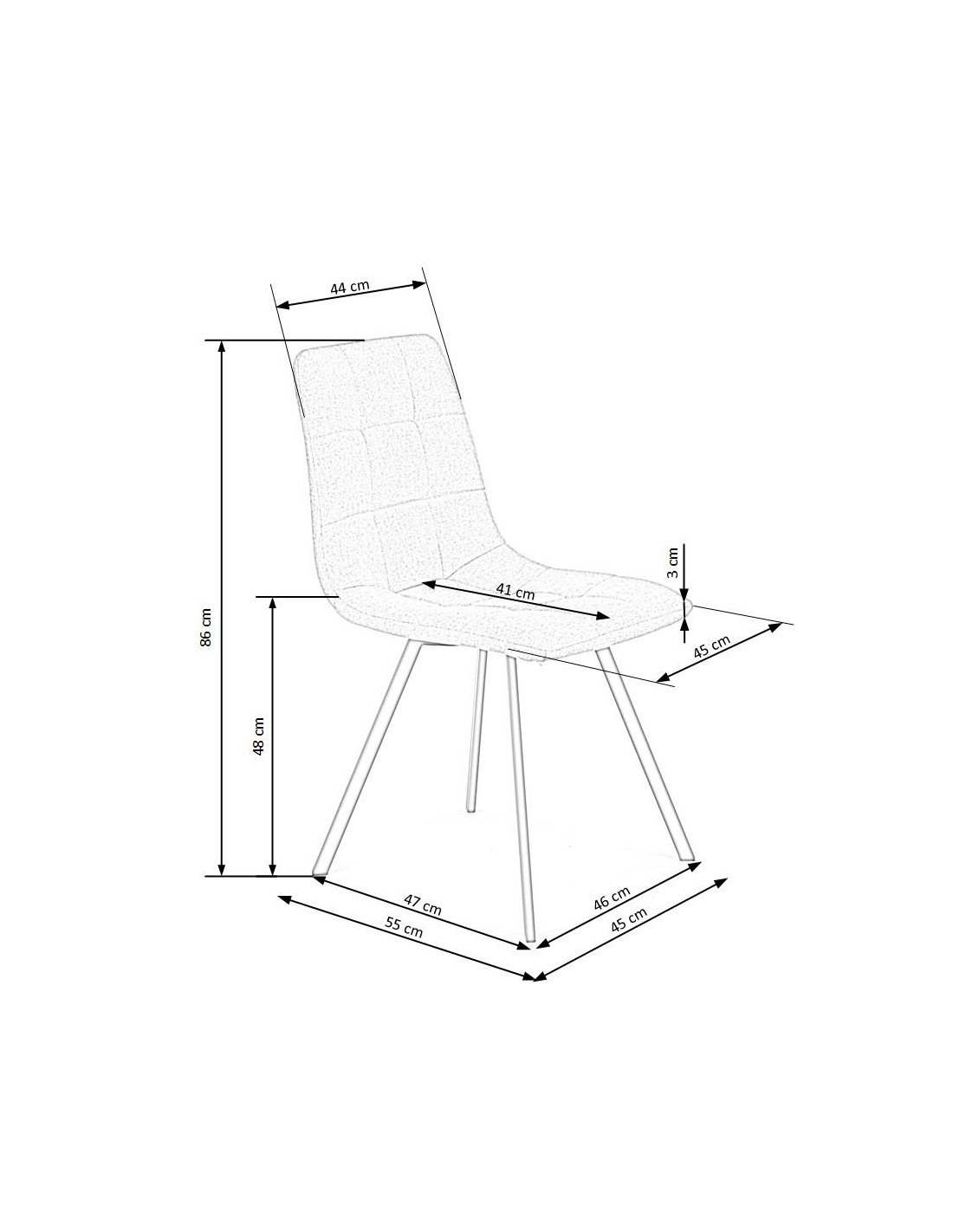 Szerokość wynosi 45 cm, głębokość 55 cm, a wysokość to 86 cm, z wysokością siedziska na poziomie 48 cm.