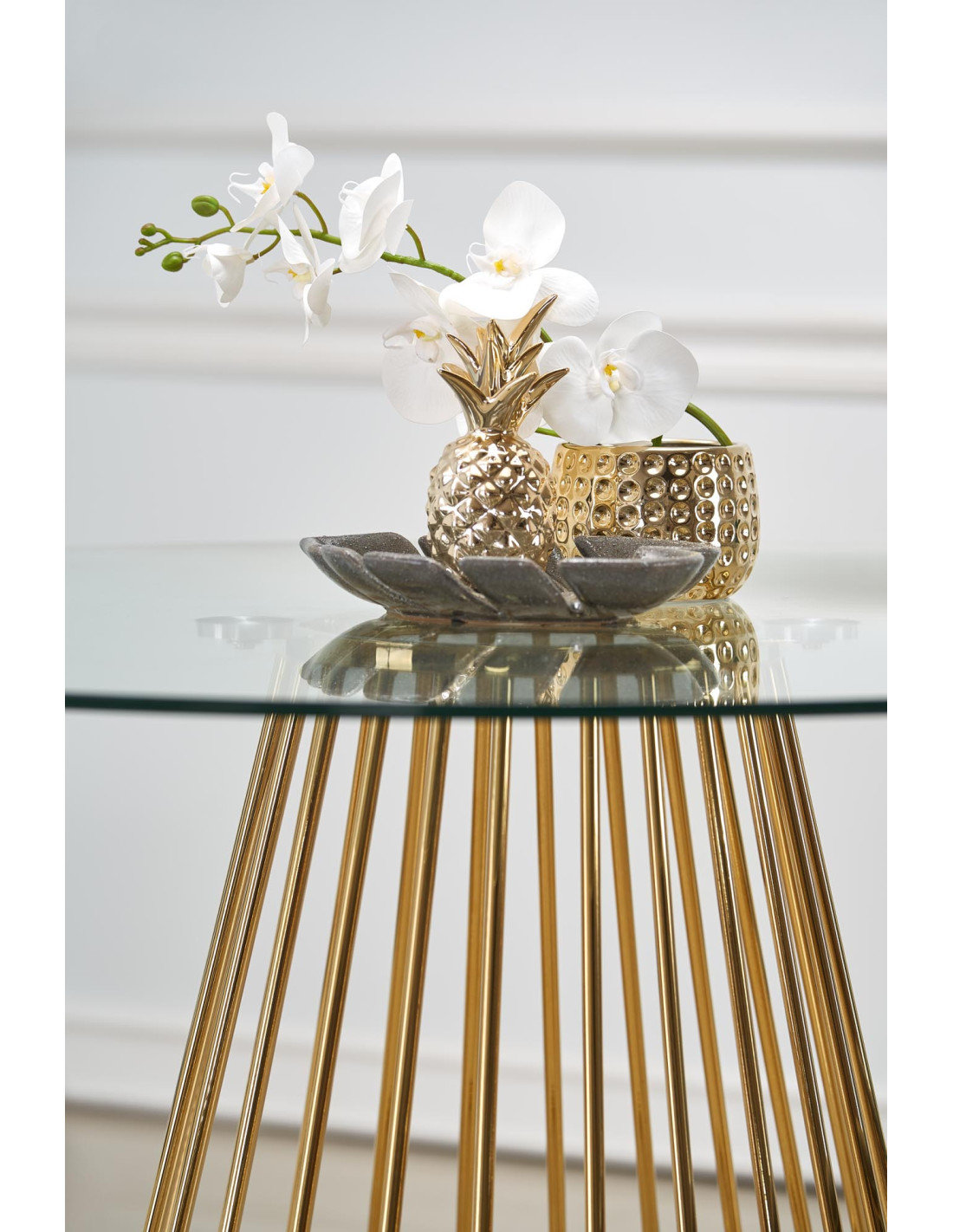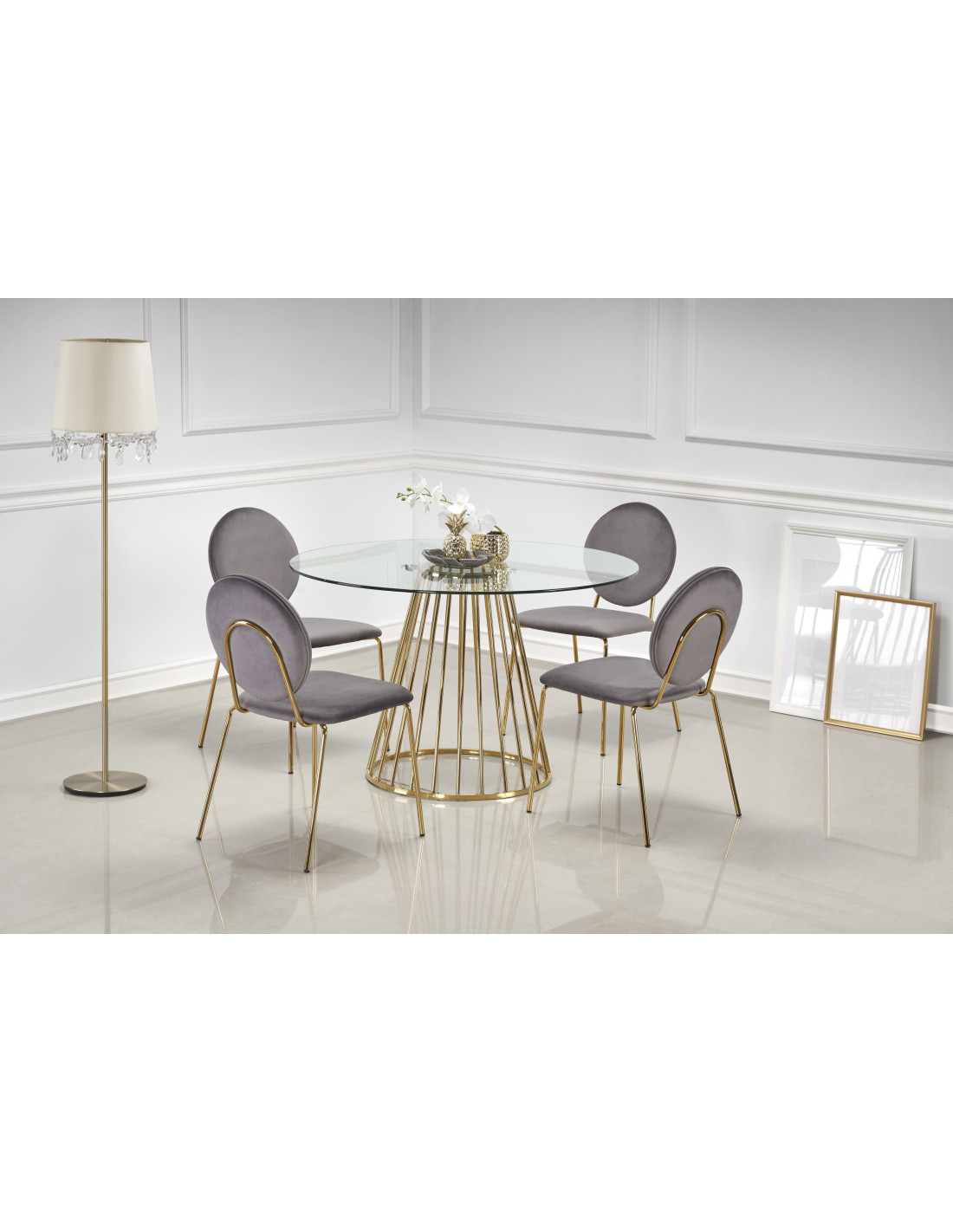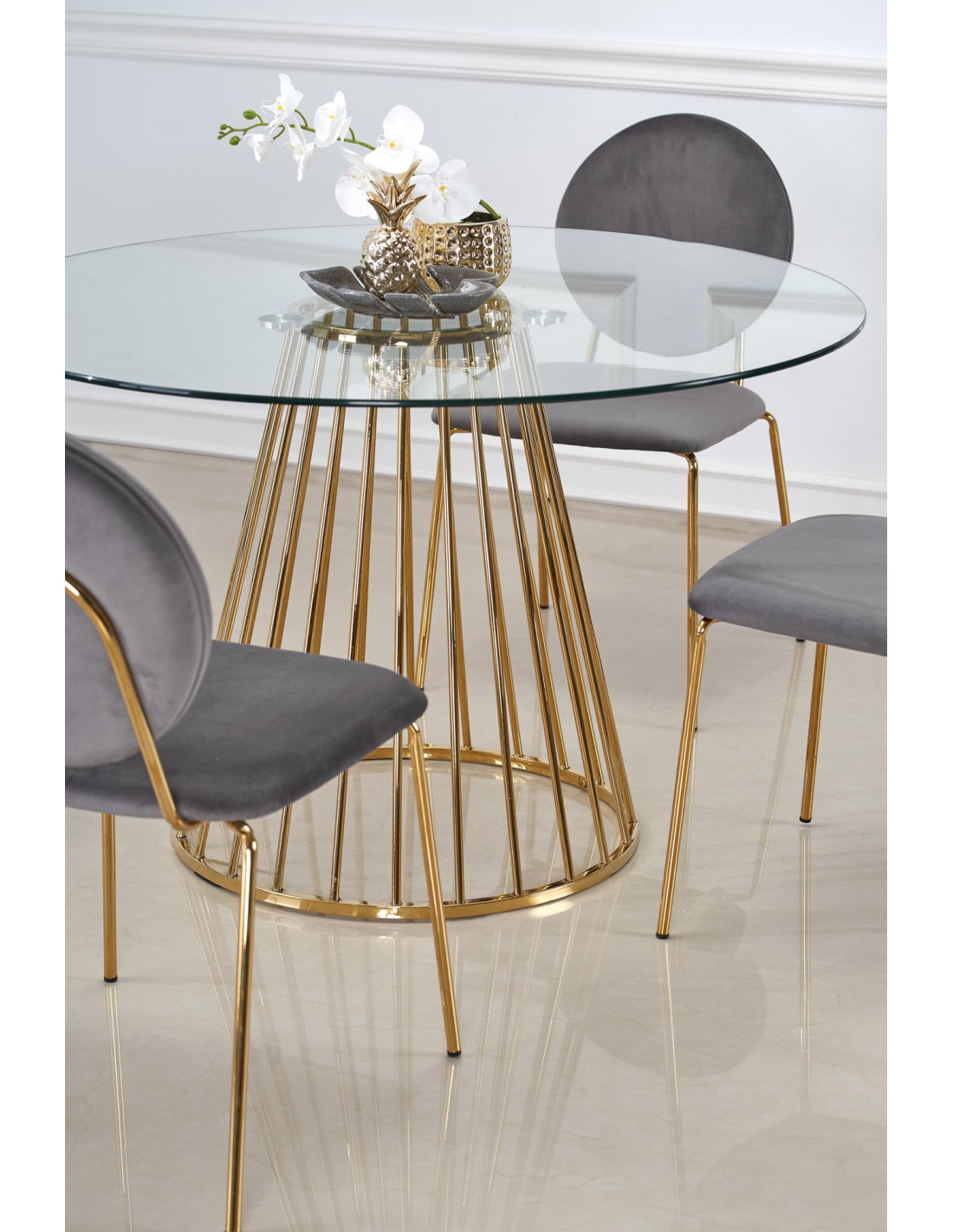 Szukasz rozwiązania? Oto ono! Stół okrągły LIVERPOOL łączy w sobie nowoczesny design z luksusowym wykończeniem. Jego szklany blat o średnicy 120 cm oraz nogi w złotym połysku przyciągają wzrok i dodają elegancji każdemu wnętrzu. Geometryczna, ażurowa konstrukcja nóg w kształcie stożka sprawia, że stół nie tylko wygląda efektownie, ale również doskonale komponuje się z różnorodnymi aranżacjami.