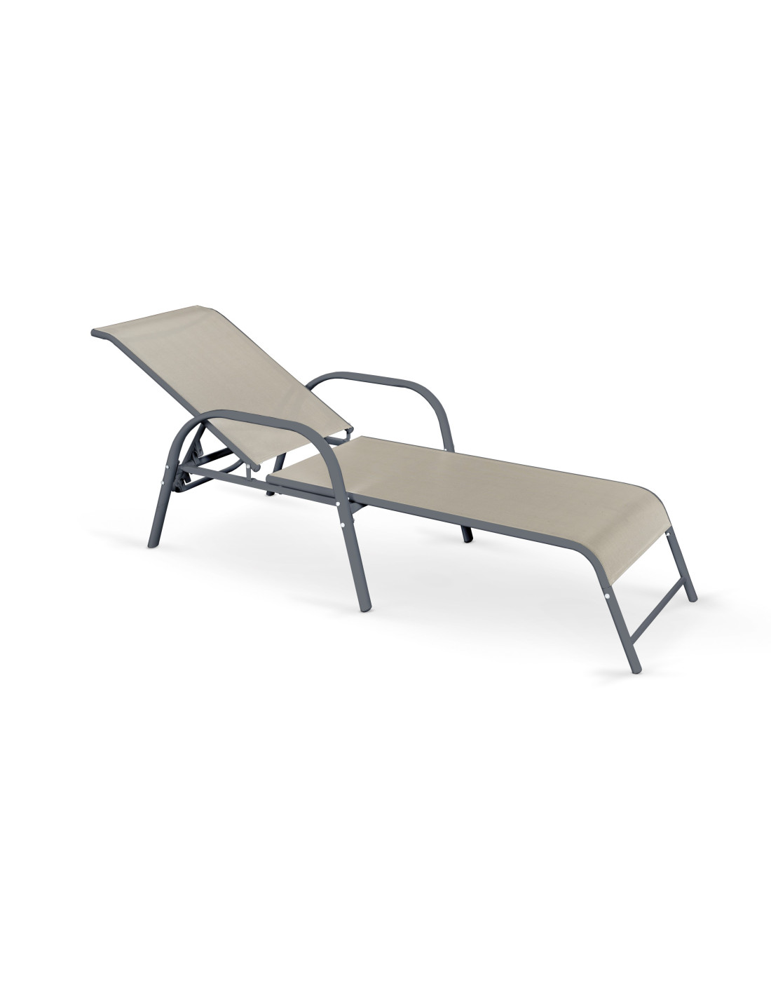 Leżak charakteryzuje się prostokątnym kształtem, wzbogaconym lekko zaokrąglonymi krawędziami, co dodaje mu nowoczesnego wyrazu. Metalowa rama w ciemnoszarym kolorze, zestawiona z jasnoszarym siedziskiem i oparciem, tworzy harmonijną całość. Solidna i stabilna konstrukcja zapewnia bezpieczeństwo podczas użytkowania.