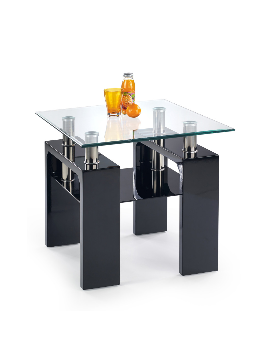 Ława Brenda H wykonana jest z przezroczystego szkła oraz MDF lakierowanego w kolorze czarnym.