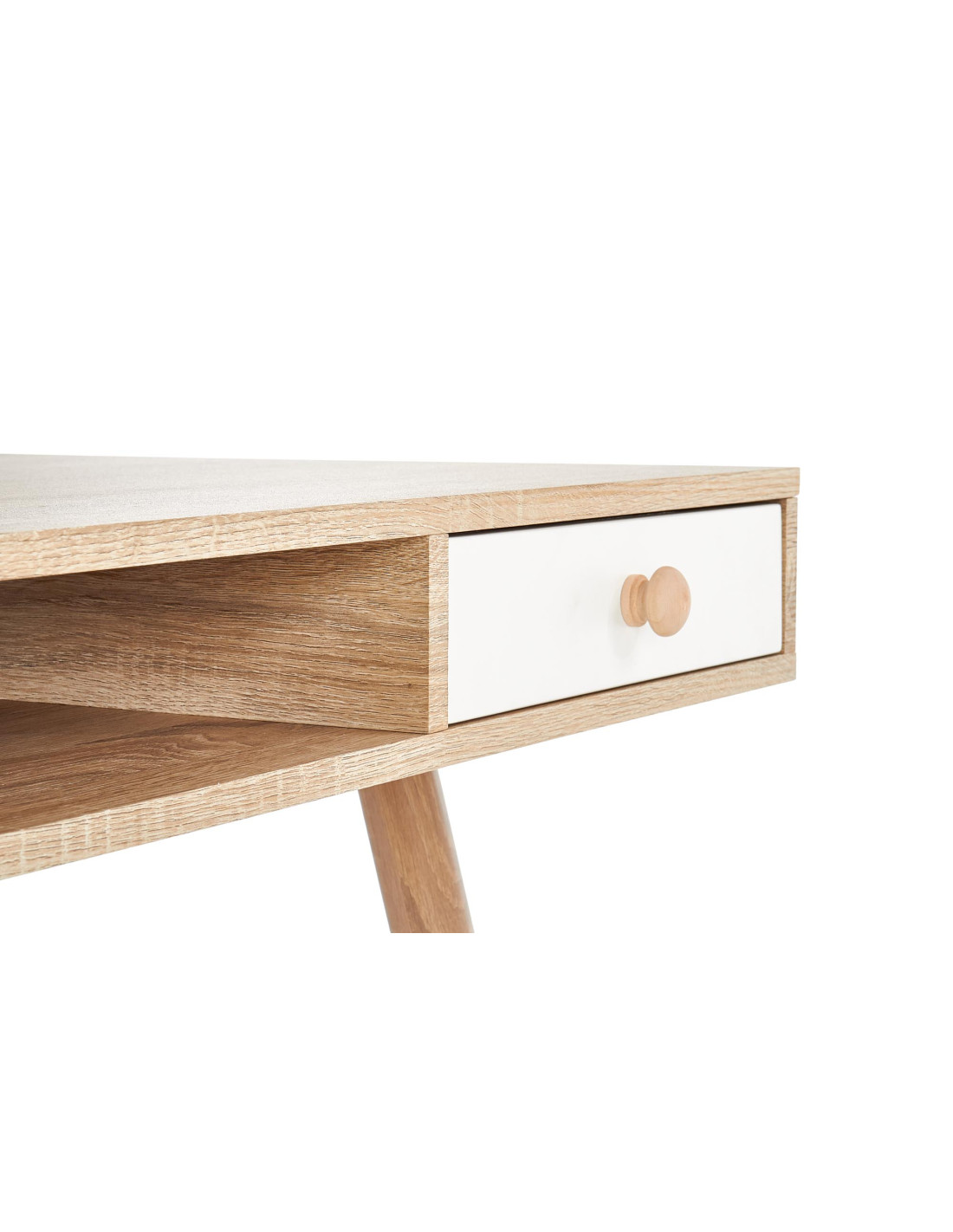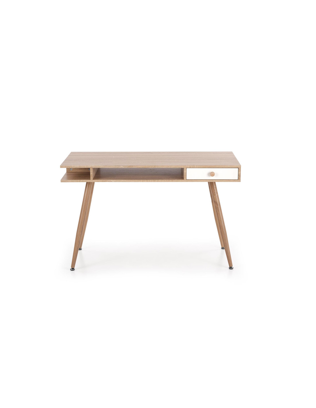 Biurko wyposażone jest w jedną szufladę z białym frontem i okrągłym uchwytem, a także otwartą półkę, idealną na książki czy dekoracje. Dzięki przemyślanej konstrukcji, jest to funkcjonalne miejsce do pracy lub nauki, które świetnie wpisuje się w różnorodne aranżacje wnętrz.
