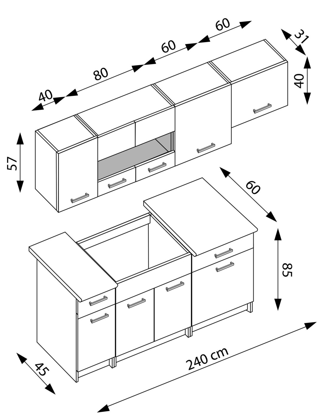 - ☑️ Wysokość szafek górnych: 57 i 40 cm
