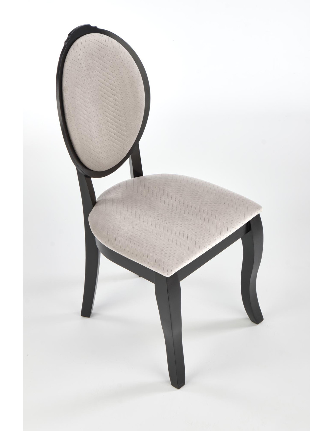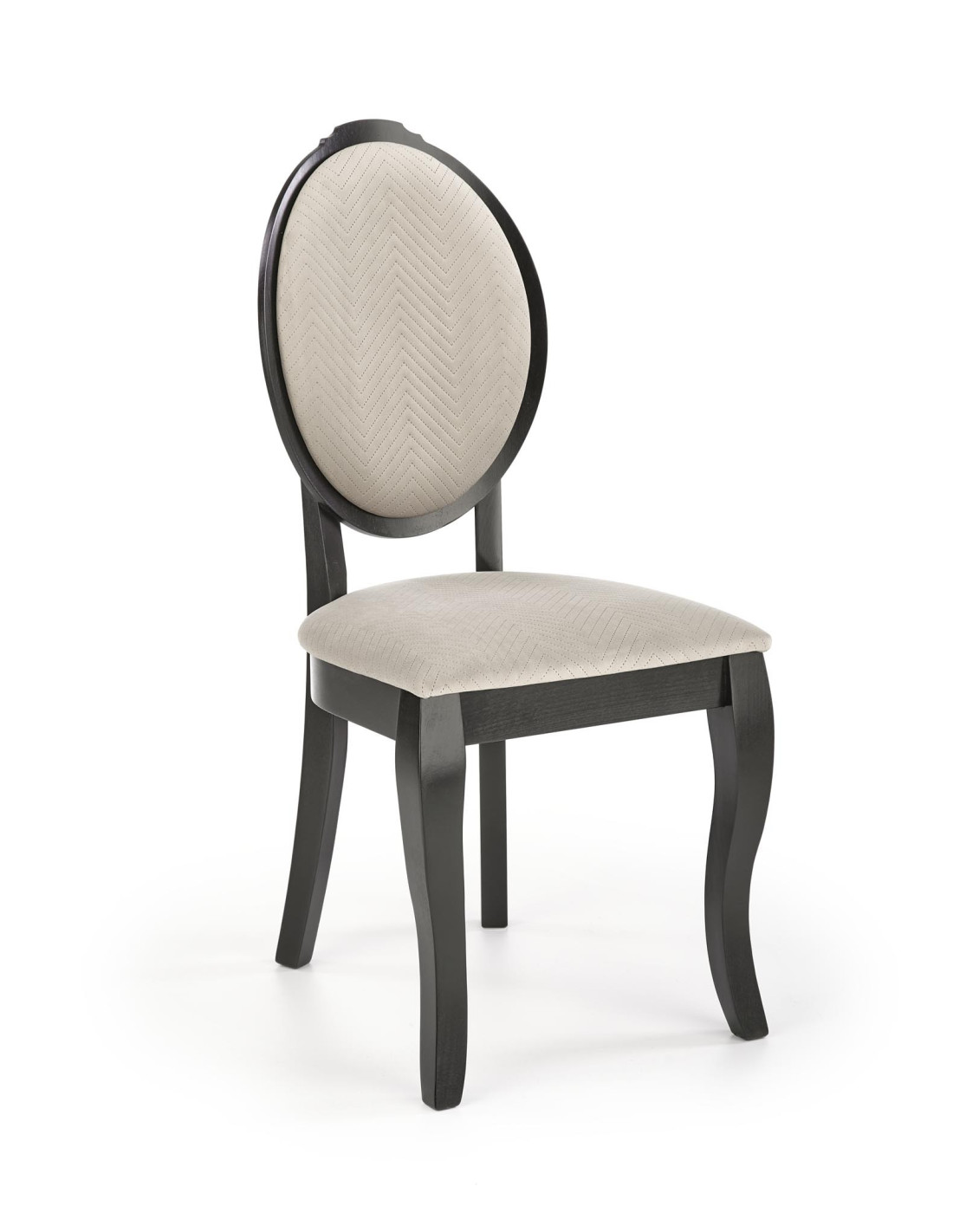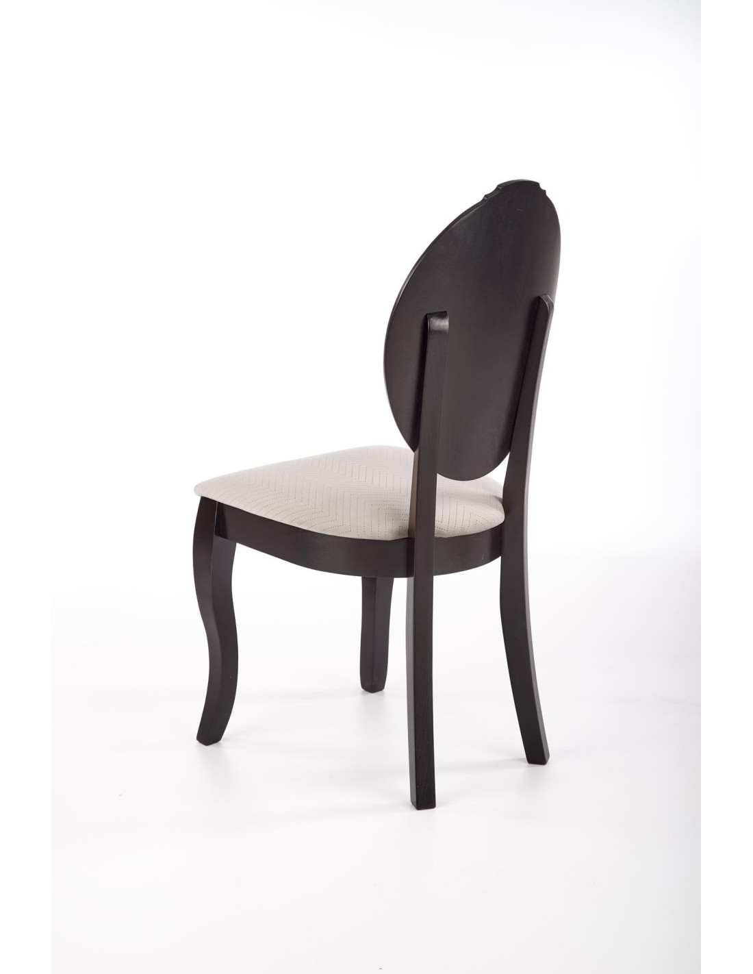 Krzesło wykonane jest z drewna litego bukowego w kolorze czarnym oraz tkaniny w jasnobeżowym odcieniu, co zapewnia mu wyjątkowy charakter.
