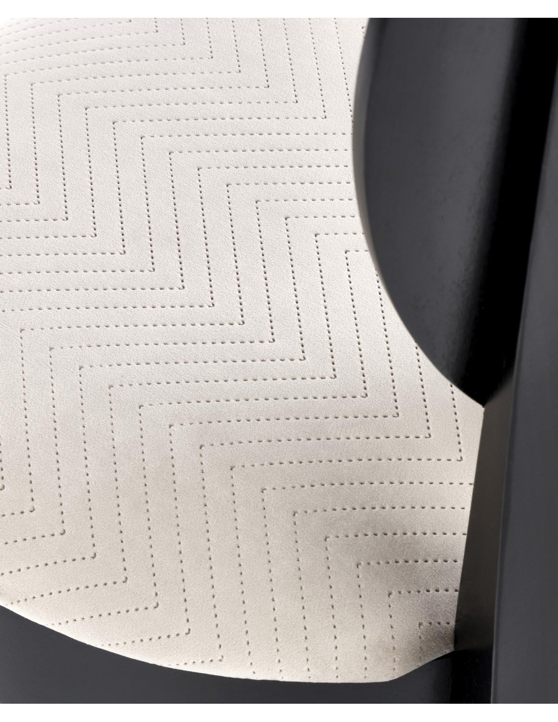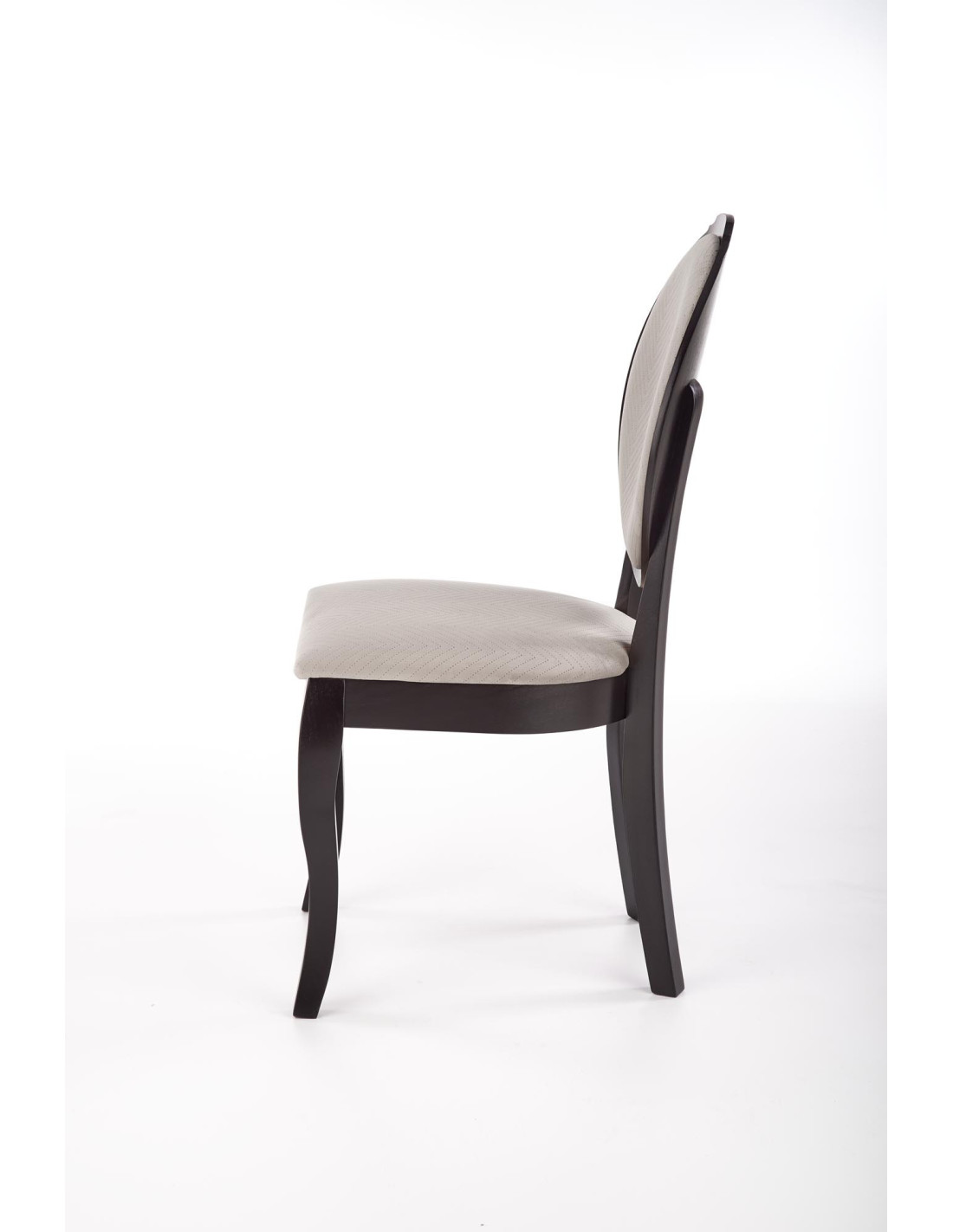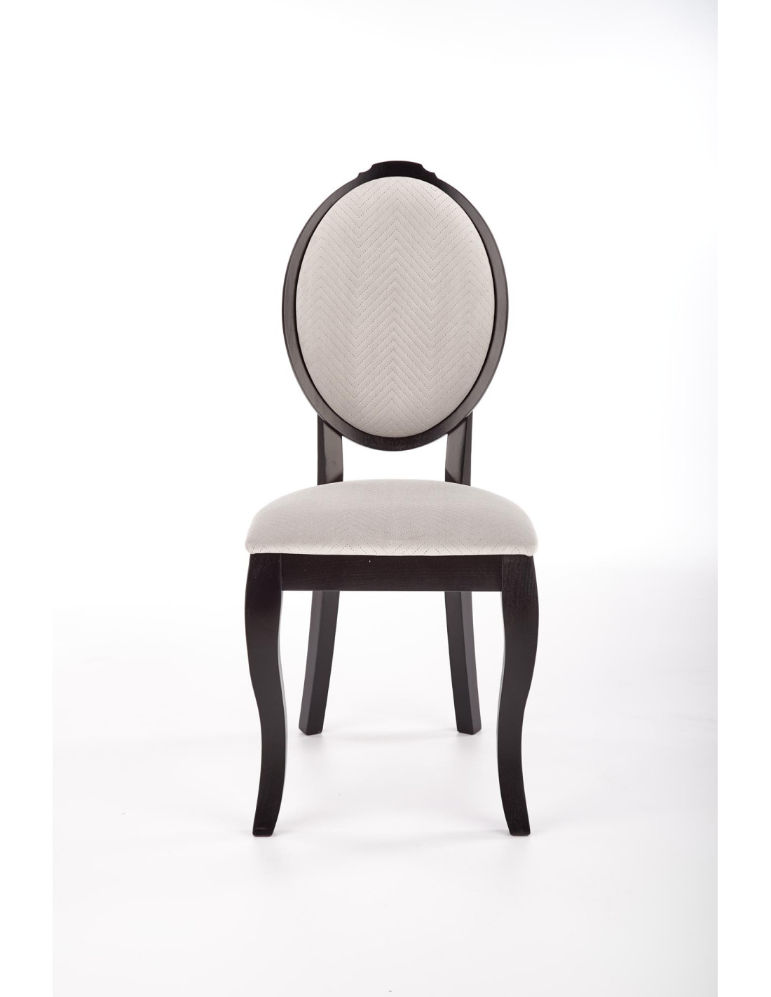 Krzesło wykonane jest z drewna litego bukowego w kolorze czarnym oraz tkaniny w jasnobeżowym odcieniu, co zapewnia mu wyjątkowy charakter.