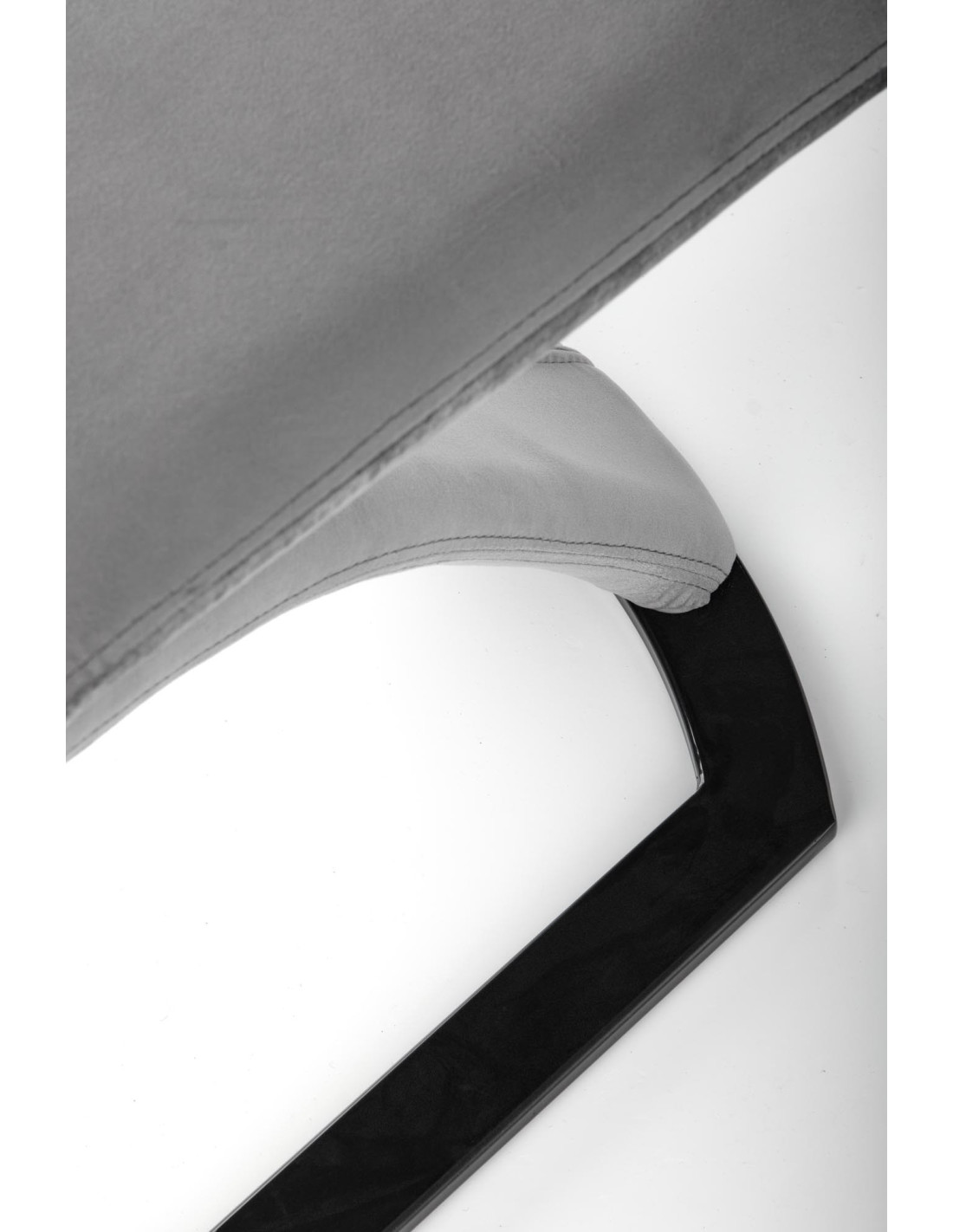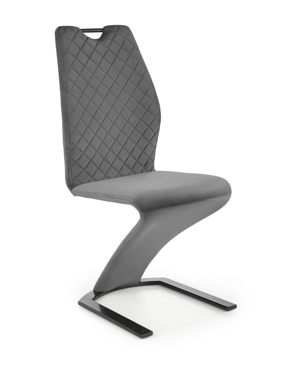 Krzesło K442 wyróżnia się pikowanym oparciem, zakrzywioną podstawą w formie litery "Z" oraz nowoczesnym designem w kolorze popielatym.