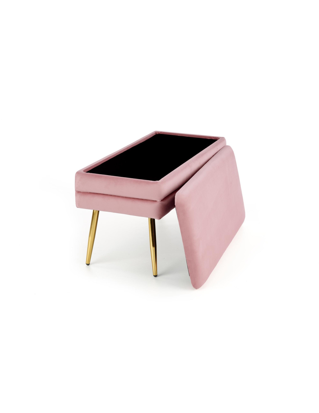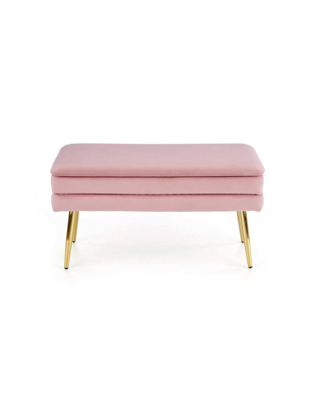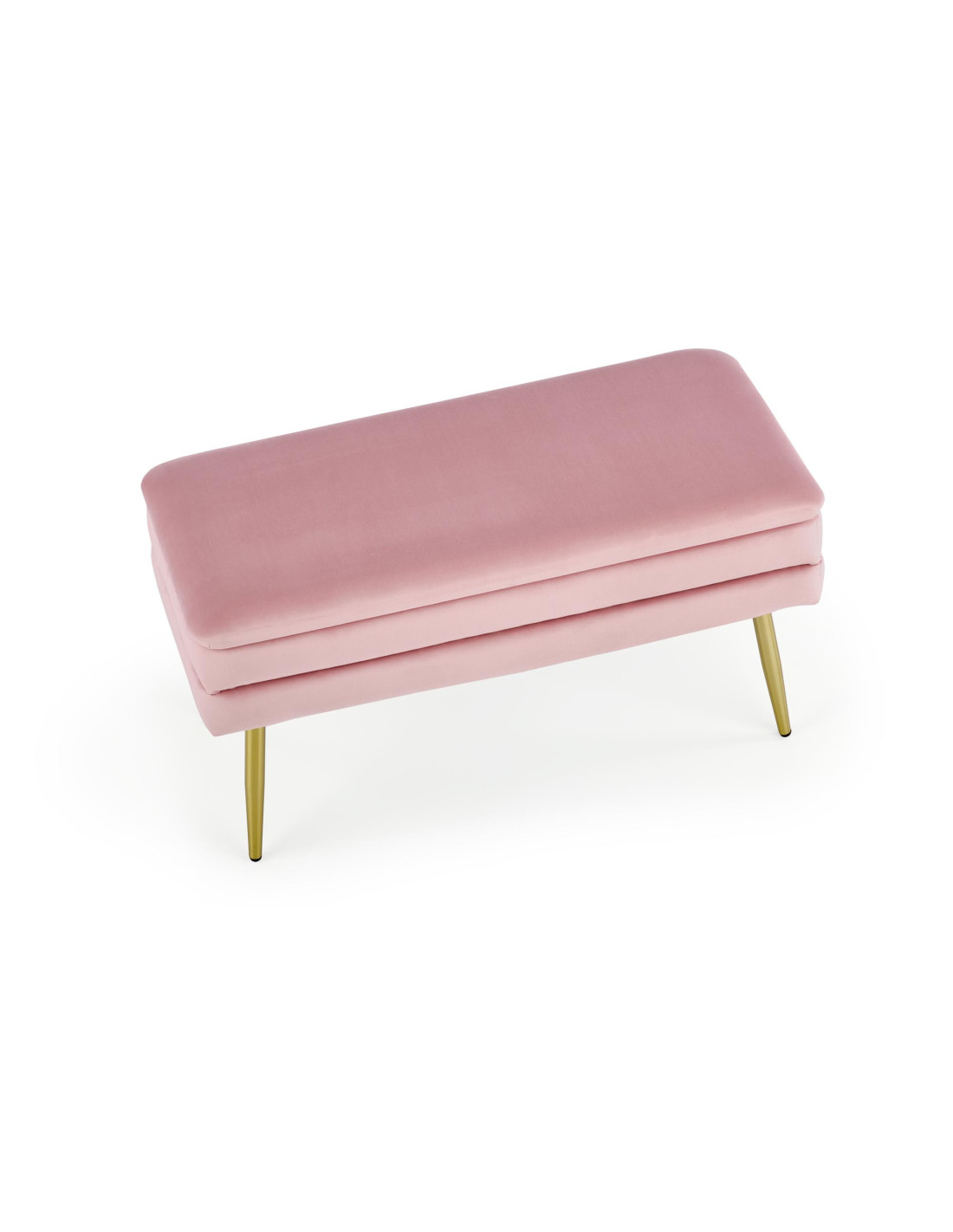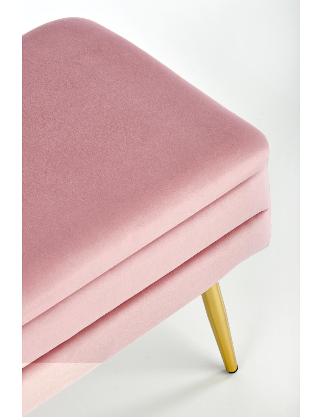 Ławka VELVA wyróżnia się prostokątnym kształtem, miękkim siedziskiem z tkaniny velvet oraz złotymi smukłymi nogami. Dodatkowo posiada funkcję pojemnika, co czyni ją bardzo praktyczną.