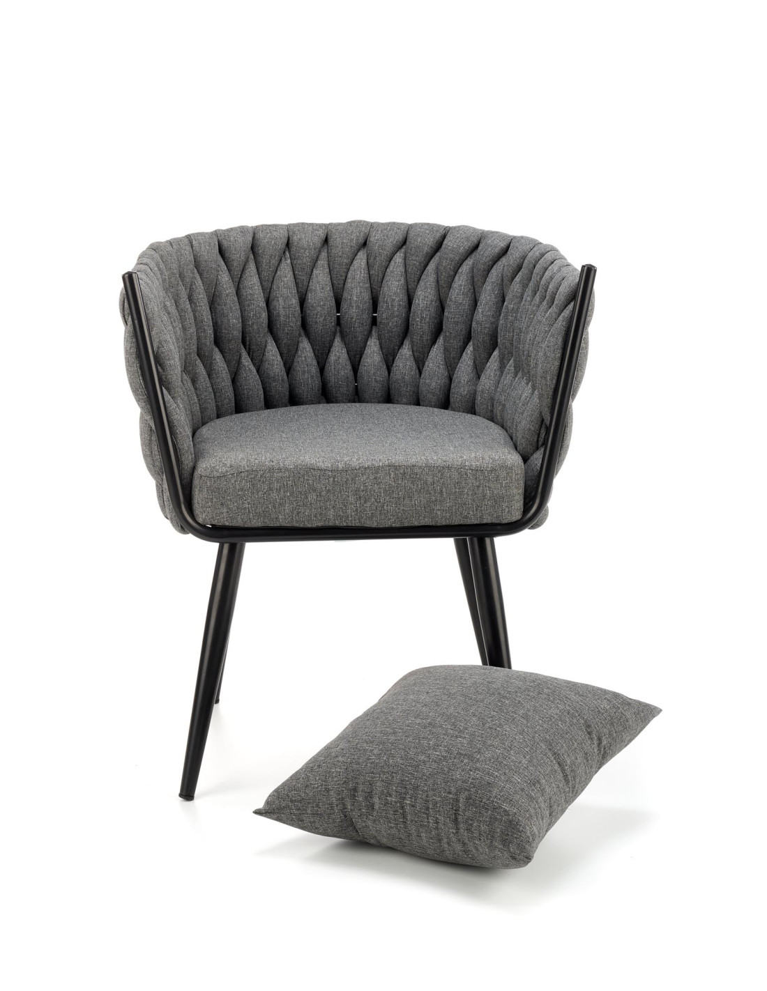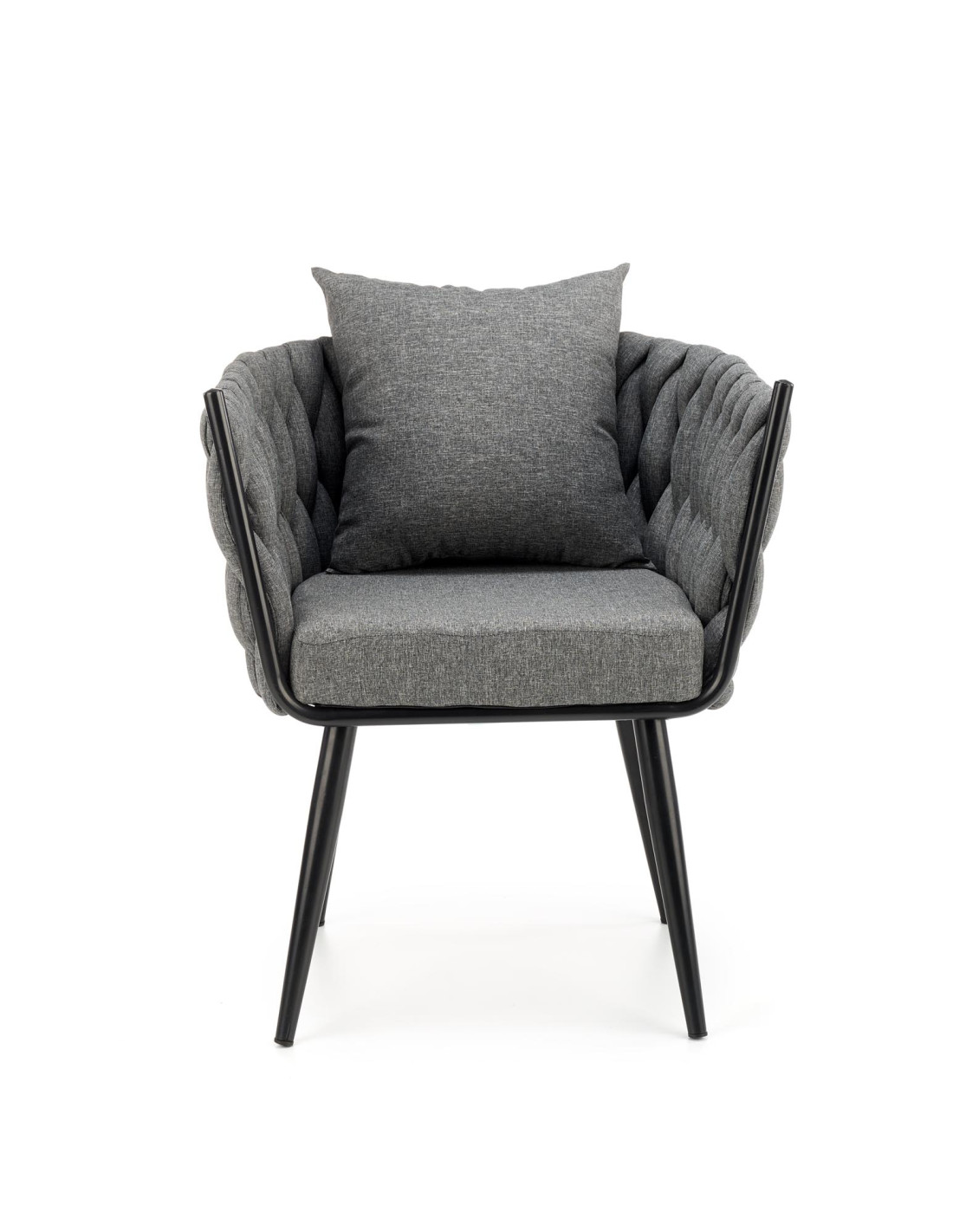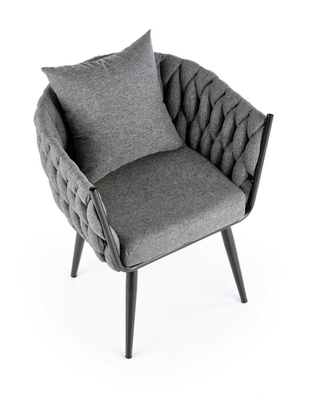 Fotel wyróżnia się plecionym oparciem oraz nowoczesną metalową ramą, które nadają mu unikalny charakter.