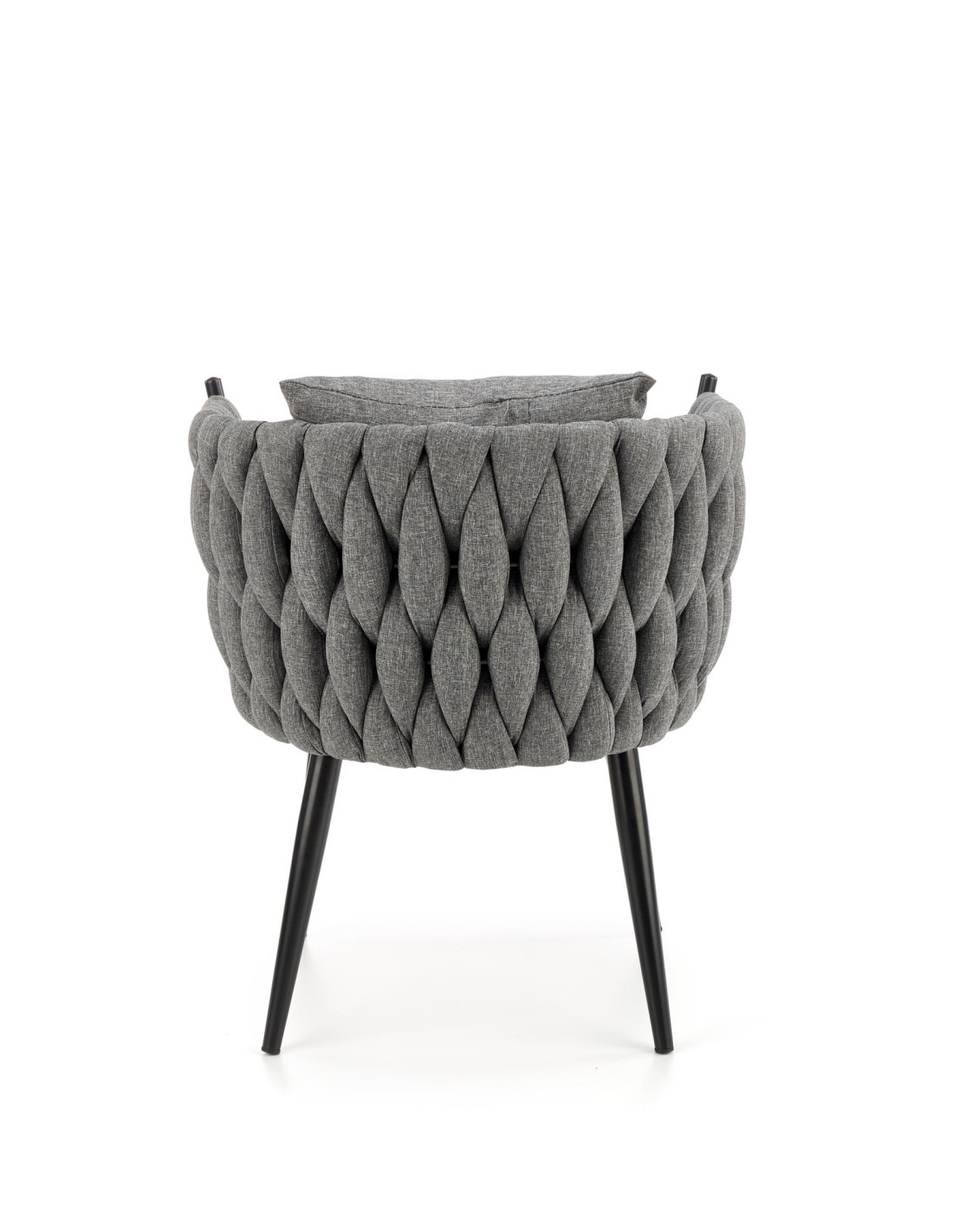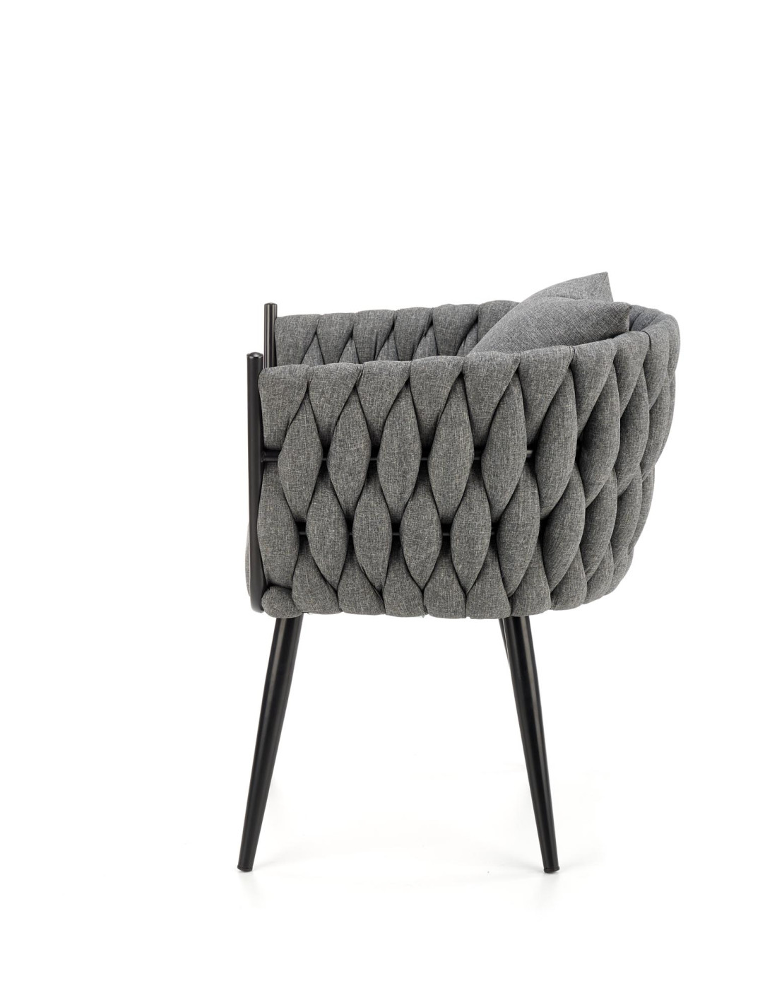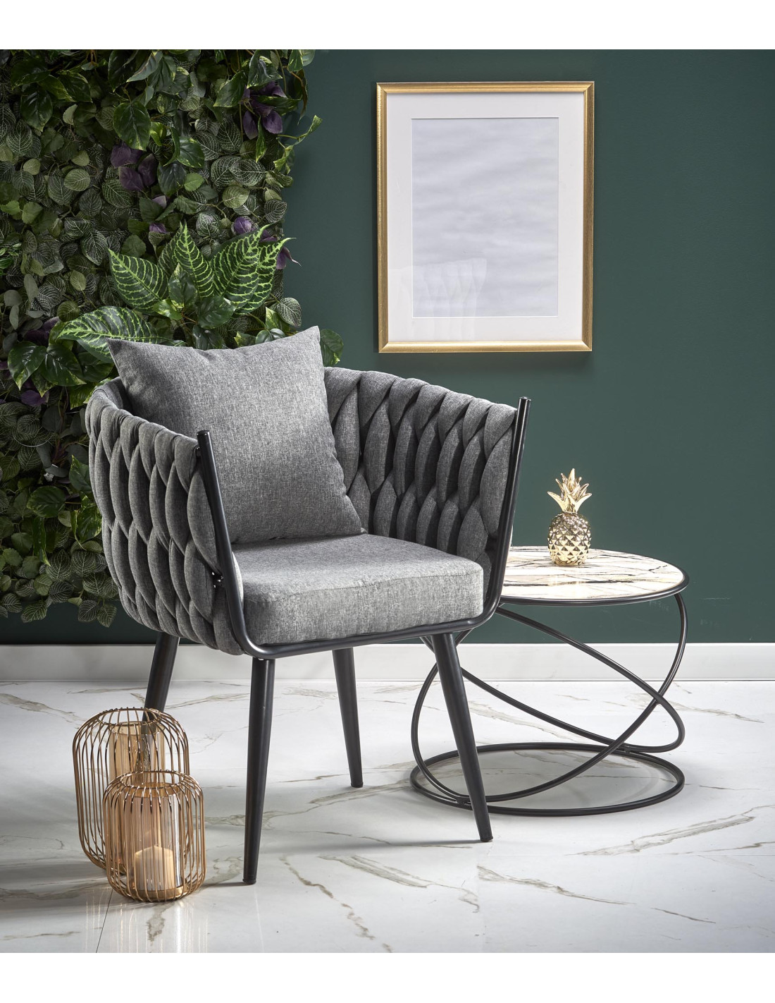 Fotel wyróżnia się plecionym oparciem oraz nowoczesną metalową ramą, które nadają mu unikalny charakter.