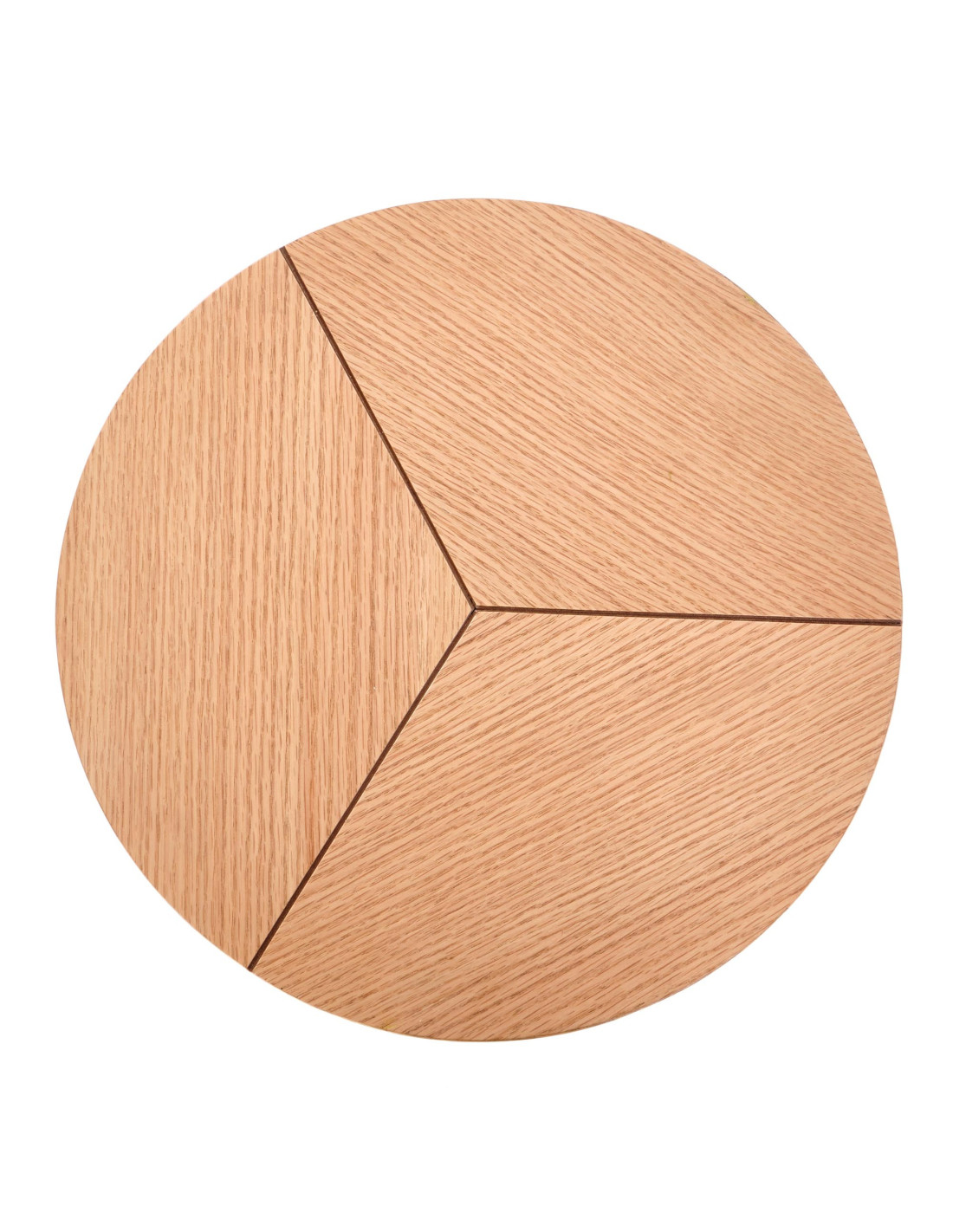 Ożyw swoją przestrzeń! Okrągła ława KARIDA S to wyjątkowy mebel, który łączy nowoczesny minimalizm z praktycznością. Jej średnica 45 cm sprawia, że doskonale wkomponuje się w mniejsze wnętrza, dodając im charakteru. Blat ławy, wykonany z MDF w naturalnym odcieniu dębu, podzielony jest na cztery symetryczne sekcje, co nadaje mu unikalny wygląd. Czarny metalowy stelaż w trójkątnej podstawie zapewnia stabilność oraz nowoczesny akcent.