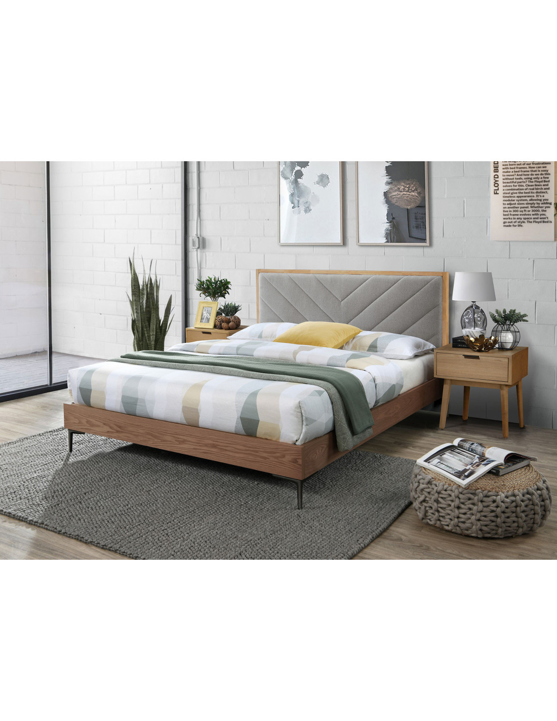 Łóżko Antimo wykonane jest z MDF-u oraz okleiny naturalnej, tkaniny tapicerskiej i stali malowanej proszkowo.