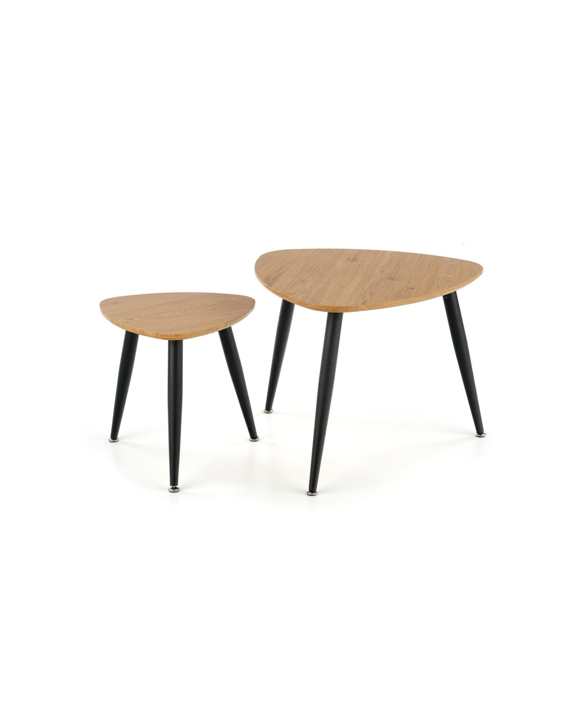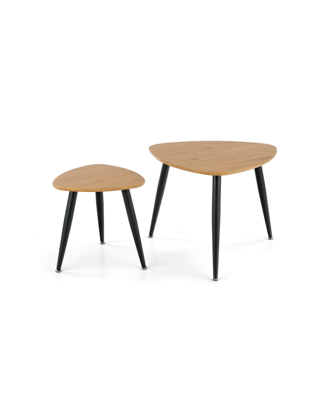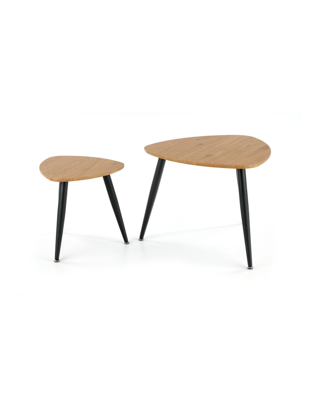 Ożyw swoją przestrzeń! Zestaw 2 ław NICEA to harmonijne połączenie nowoczesnego minimalizmu z funkcjonalnością. Trójkątne blaty o zaokrąglonych rogach, wykonane z MDF w kolorze dębu złotego, dodają ciepła i elegancji, a smukłe, czarne metalowe nogi, lekko zwężające się ku dołowi, nadają całości nowoczesny charakter. Te ławy nie tylko spełniają swoje praktyczne funkcje, ale również stanowią stylowy element dekoracyjny każdego wnętrza.
