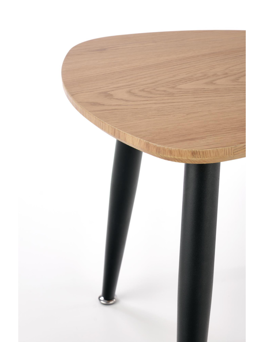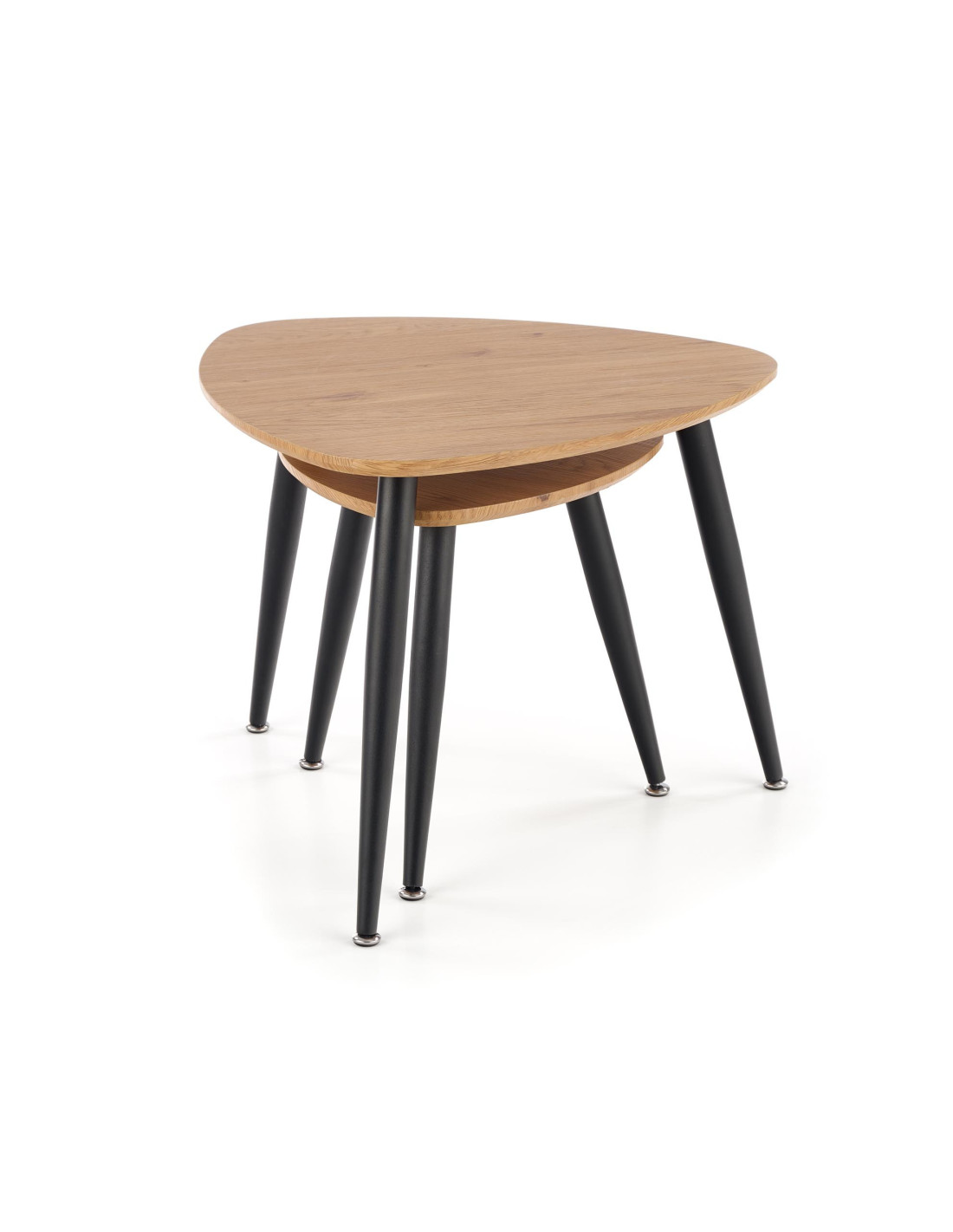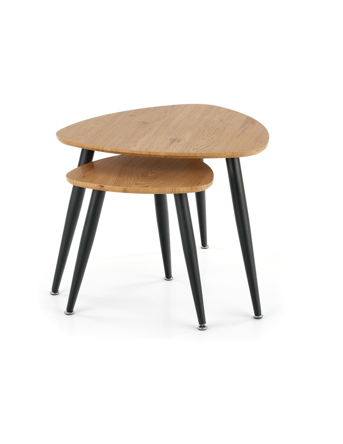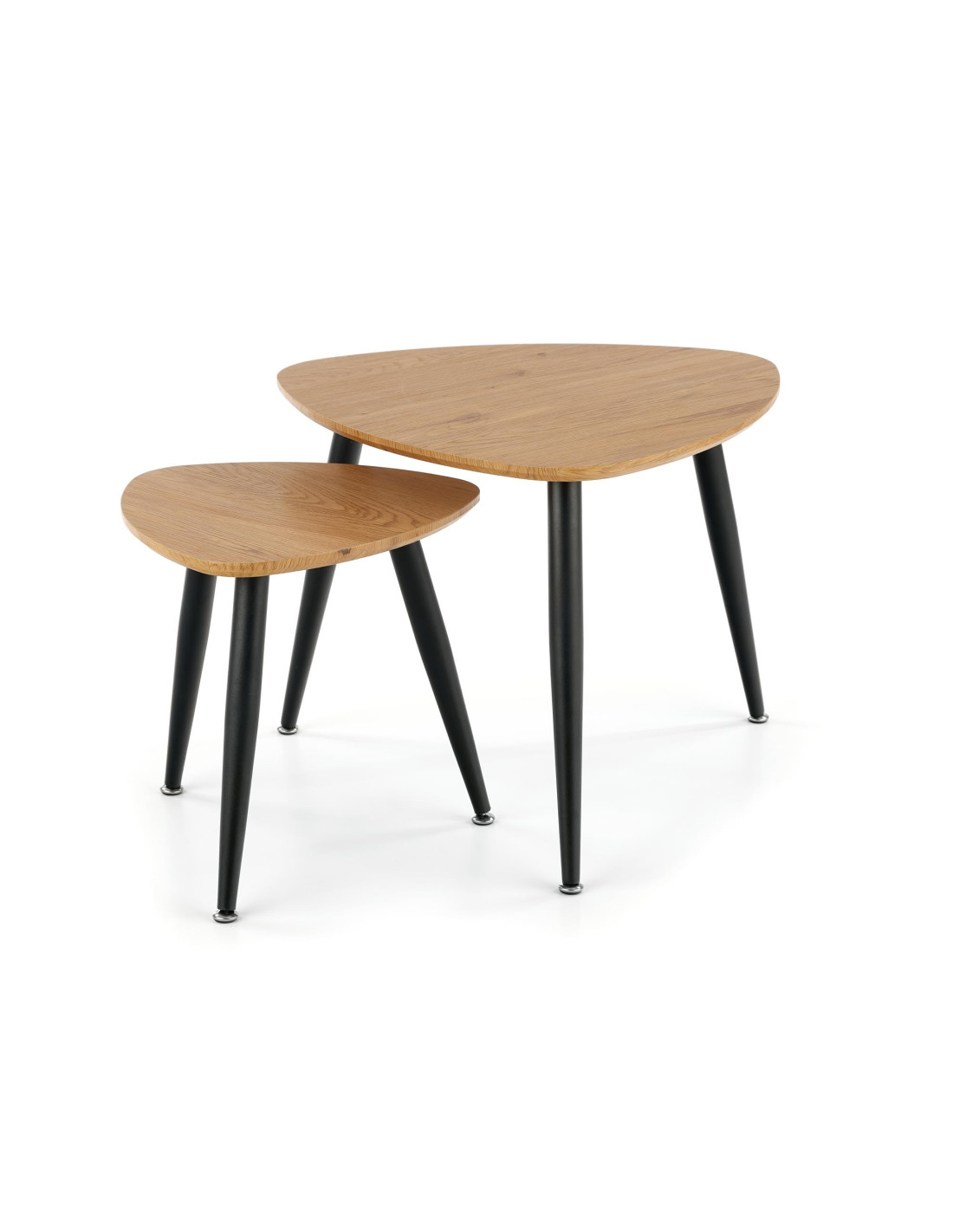 Ożyw swoją przestrzeń! Zestaw 2 ław NICEA to harmonijne połączenie nowoczesnego minimalizmu z funkcjonalnością. Trójkątne blaty o zaokrąglonych rogach, wykonane z MDF w kolorze dębu złotego, dodają ciepła i elegancji, a smukłe, czarne metalowe nogi, lekko zwężające się ku dołowi, nadają całości nowoczesny charakter. Te ławy nie tylko spełniają swoje praktyczne funkcje, ale również stanowią stylowy element dekoracyjny każdego wnętrza.