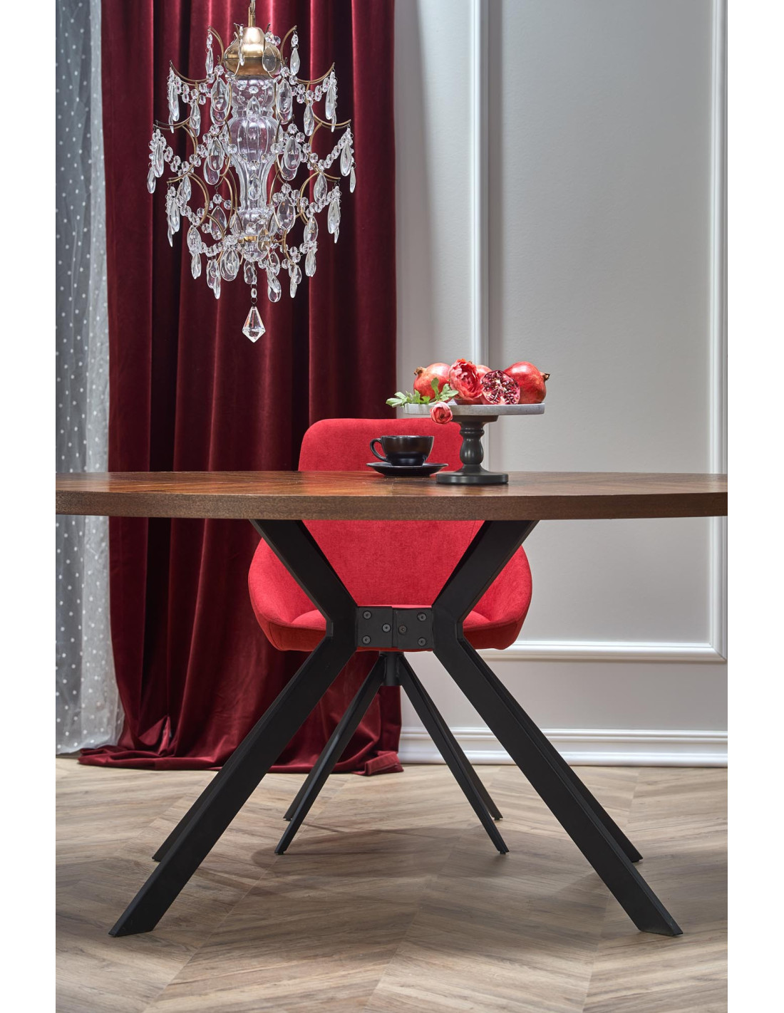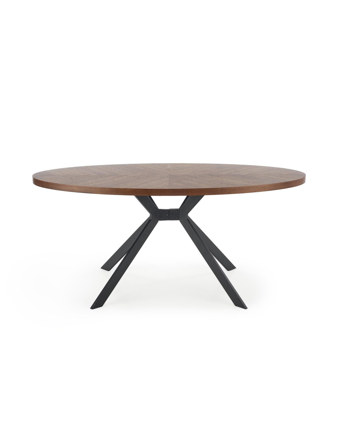 Owalny stół LOCARNO wykonany jest z MDF z naturalną okleiną orzechową oraz stalowych nóg malowanych proszkowo na czarno.