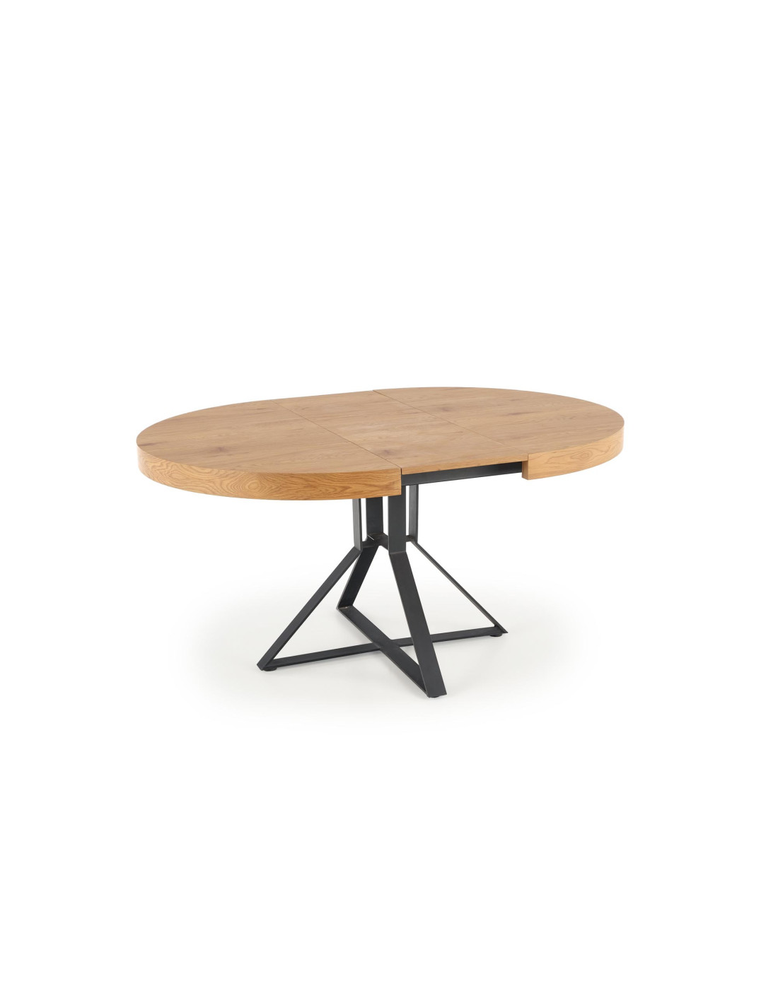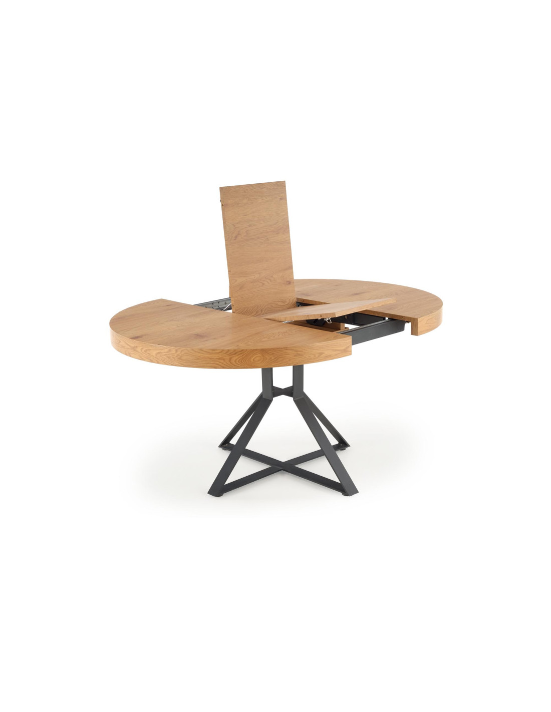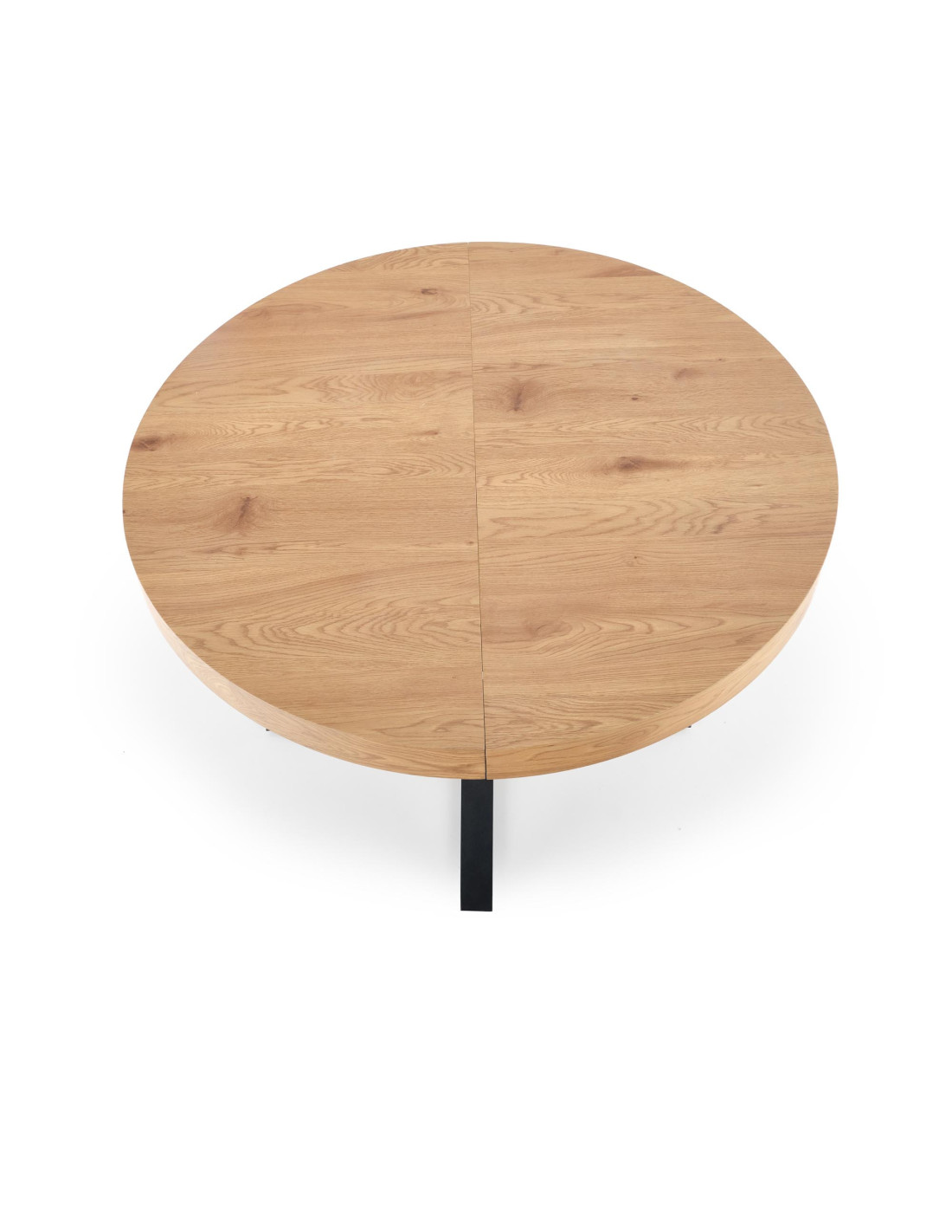 Podkreśl elegancję rozszerzanego stołu MERCY, który harmonijnie łączy nowoczesny design z industrialnym akcentem! Okrągły blat wykonany z MDF okleinowanego w kolorze dębu złotego oraz nowoczesna czarna metalowa podstawa tworzą wyjątkową kompozycję, która doskonale wpisuje się w trendy współczesnych aranżacji wnętrz. Ten stół nie tylko przyciąga wzrok, ale również oferuje praktyczne rozwiązania, które uczynią każdą chwilę spędzoną przy nim niezapomnianą.