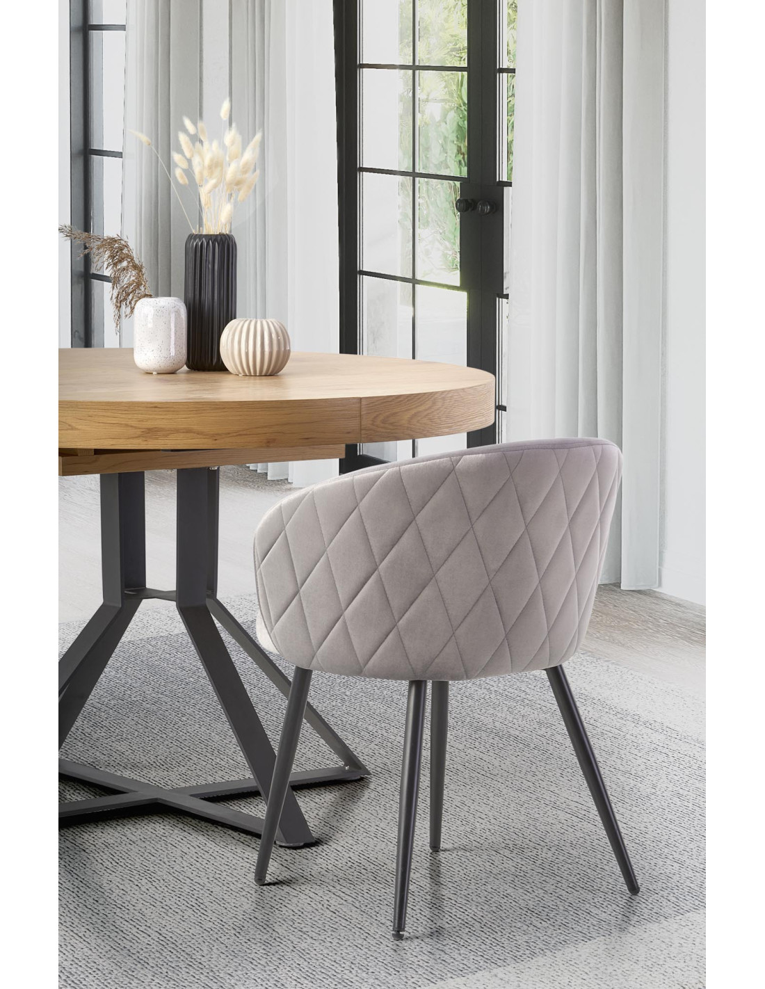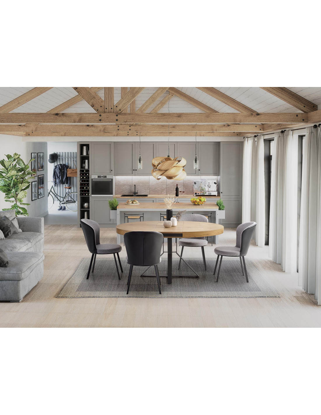 MERCY to stół rozkładany, co oznacza, że możesz dostosować jego średnicę od 120 cm do 160 cm, co sprawia, że doskonale nadaje się zarówno na codzienne posiłki, jak i na większe spotkania z rodziną i przyjaciółmi. Dzięki chowanej wkładce wewnętrznej, zyskujesz dodatkową przestrzeń, co czyni go niezwykle funkcjonalnym meblem.