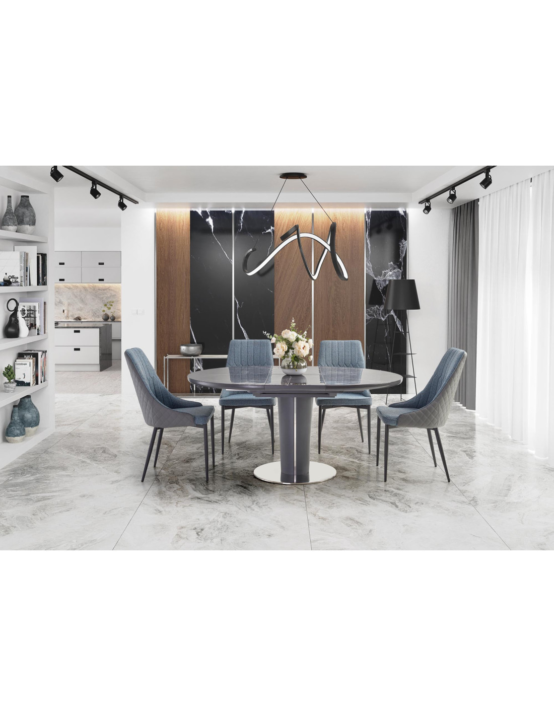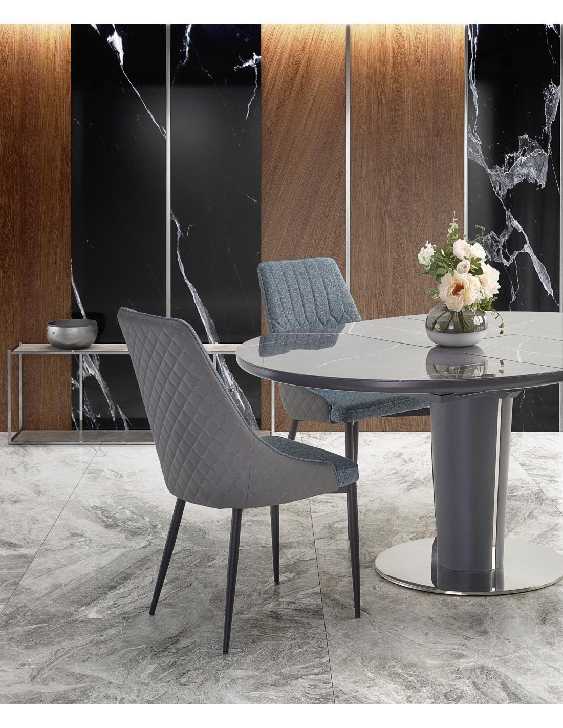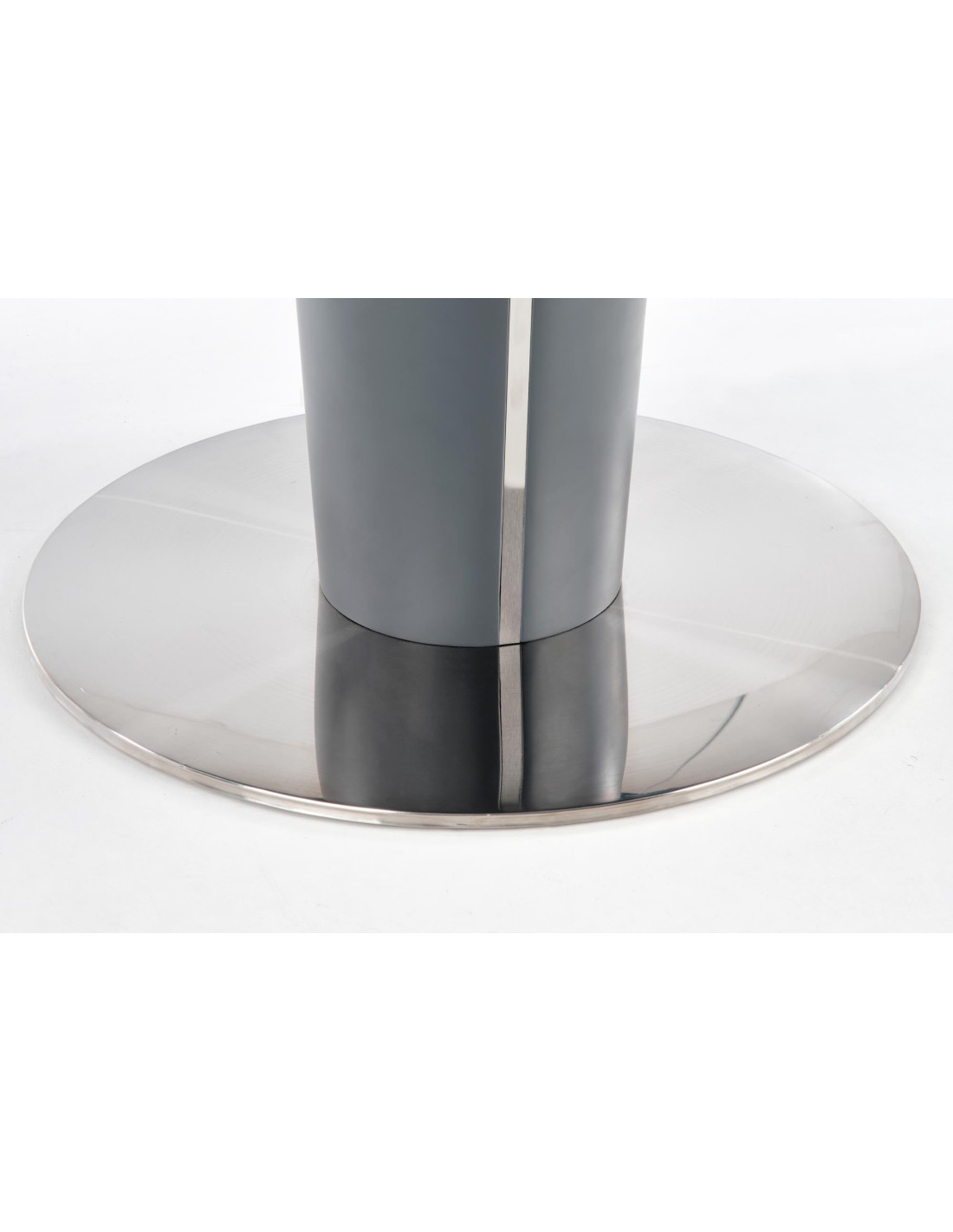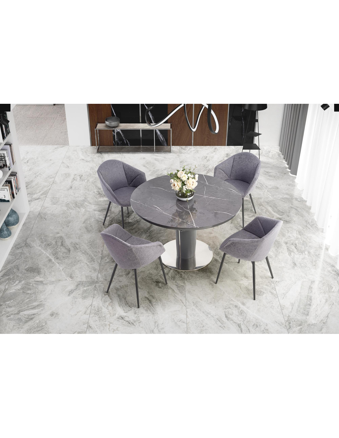 Ciesz się nowym okrągłym stołem RICARDO, który łączy w sobie elegancję i nowoczesność! Ten stół, z popielatym marmurowym blatem, wykonanym ze szkła i MDF, oraz stalową nogą, jest idealnym rozwiązaniem do każdego wnętrza. Subtelne, jasne żyłkowanie blatu naśladuje naturalny marmur, nadając mu niepowtarzalny urok, który doskonale wpisuje się w nowoczesne i industrialne aranżacje.