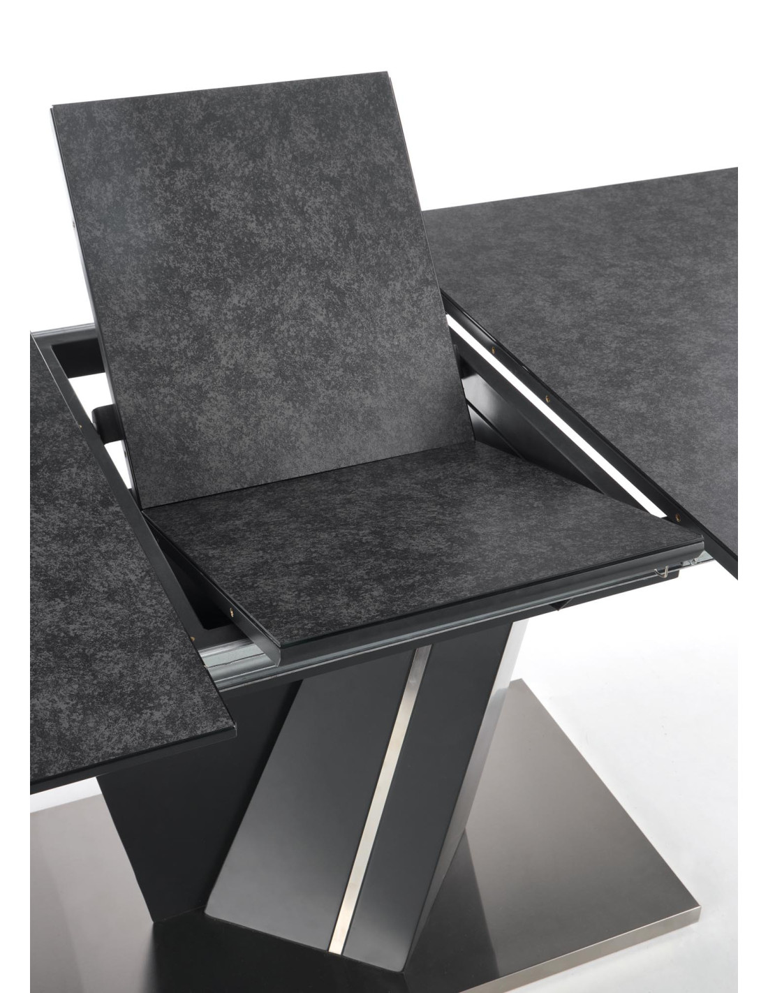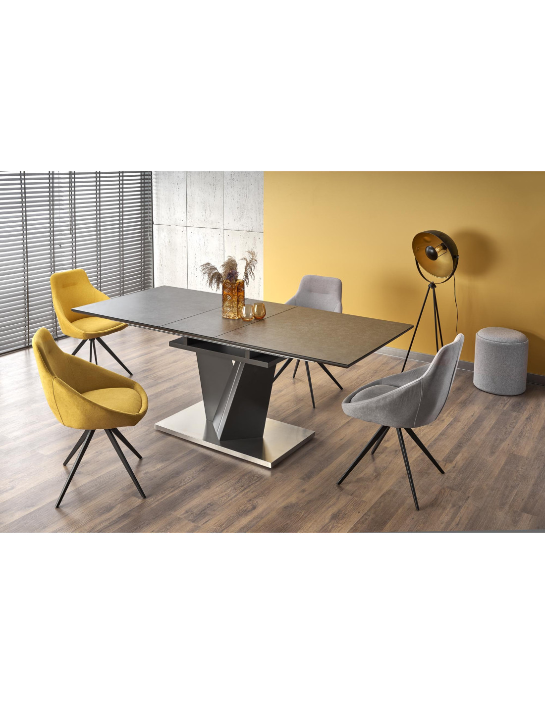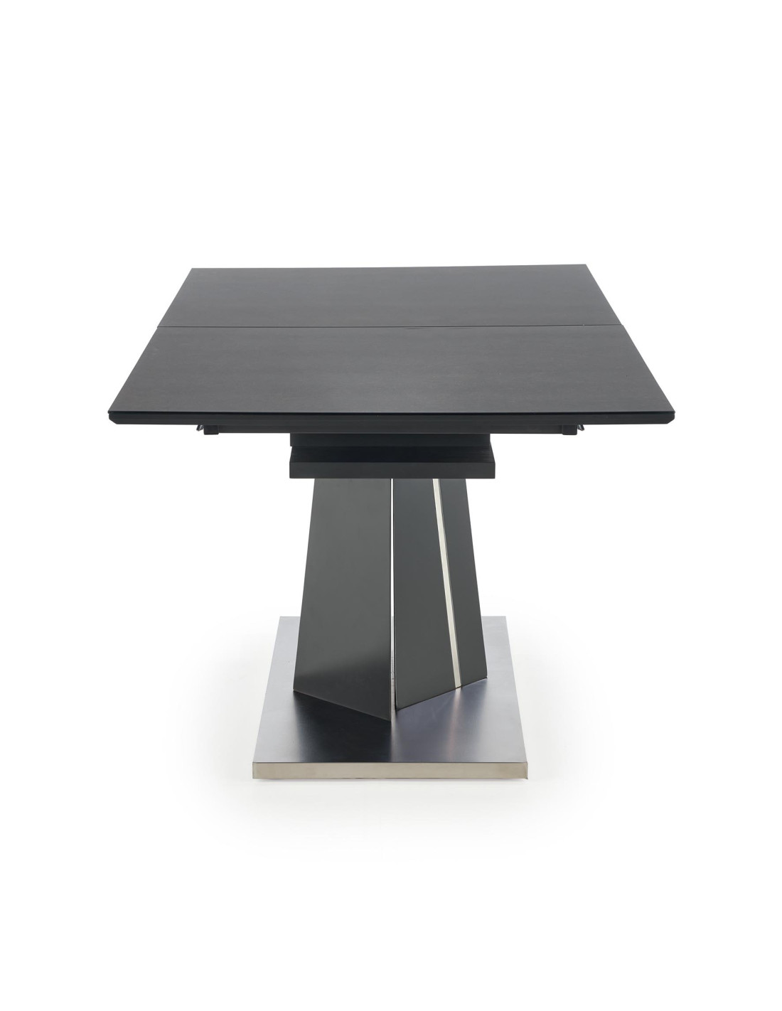 Zachwyć się rozszerzanym stołem SALVADOR, który łączy nowoczesny styl z praktycznością! Ten stół, w eleganckim ciemnym popielu, wykonany z wysokiej jakości szkła oraz płyty MDF, stanowi doskonały wybór do każdego wnętrza. Jego prostokątny kształt i solidna, geometryczna podstawa w kształcie litery V nadają mu wyjątkowego charakteru, idealnie wpisując się w nowoczesne aranżacje.