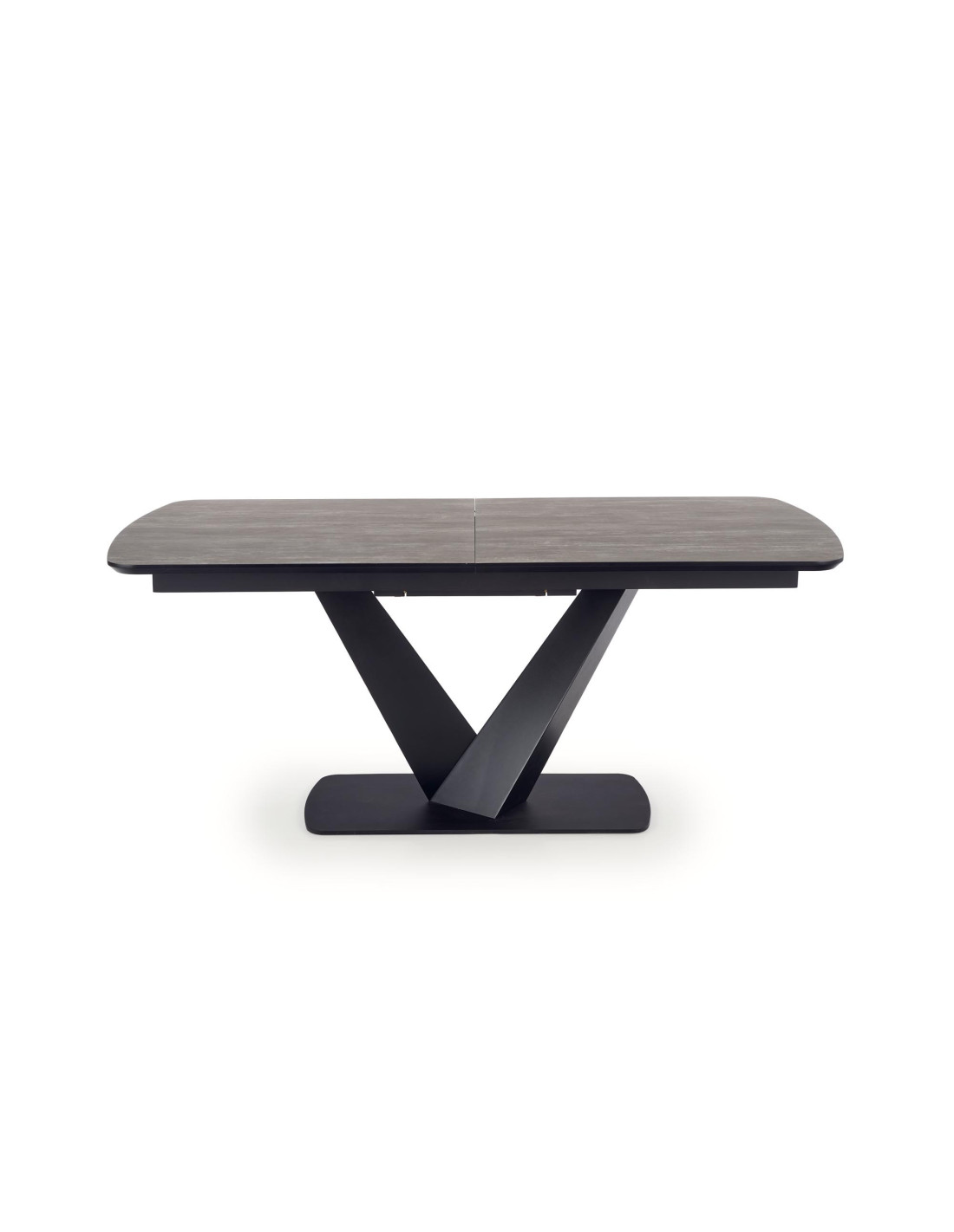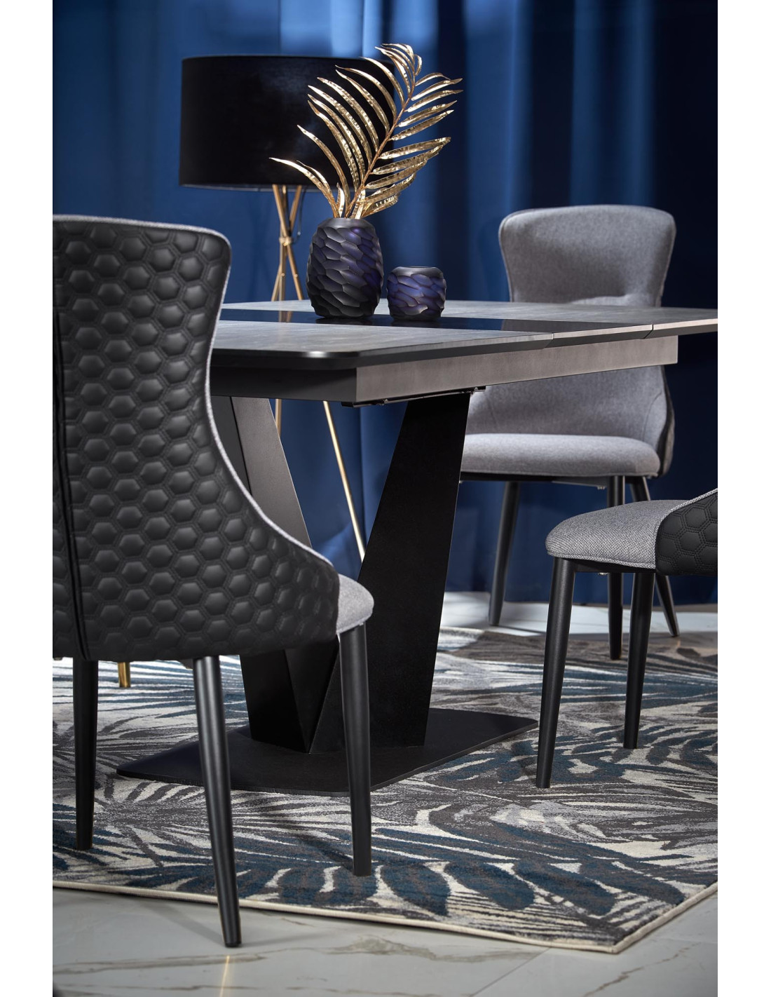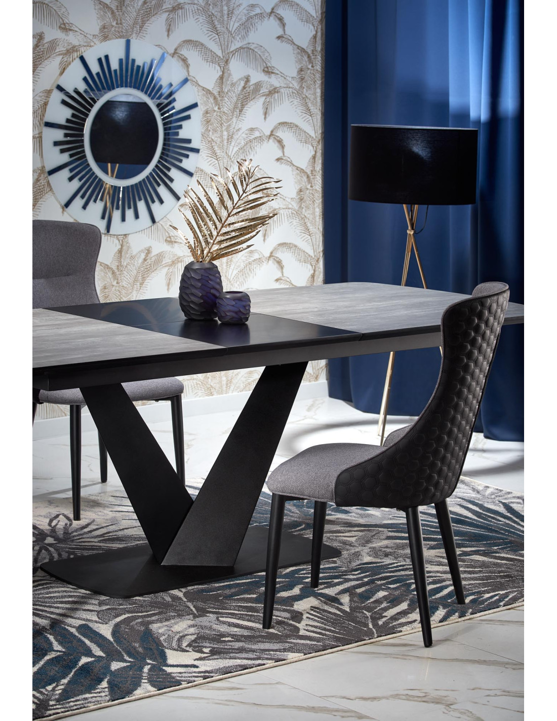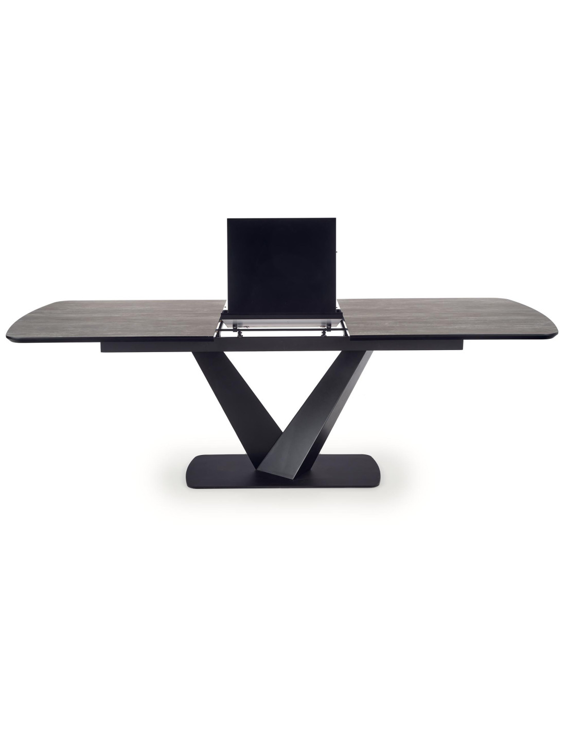 Zainspiruj się rozszerzanym stołem VINSTON, który łączy w sobie minimalistyczny design z nowoczesną funkcjonalnością! Jego prostokątny kształt z zaokrąglonymi rogami wprowadza świeżość do przestrzeni, a ciemnopopielaty blat, wykonany z MDF lakierowanego i płyty HPL, nadaje mu elegancki wygląd. Czarne nogi w kształcie litery "V" nie tylko przyciągają wzrok, ale także zapewniają stabilność i nowoczesny akcent do każdego wnętrza.
