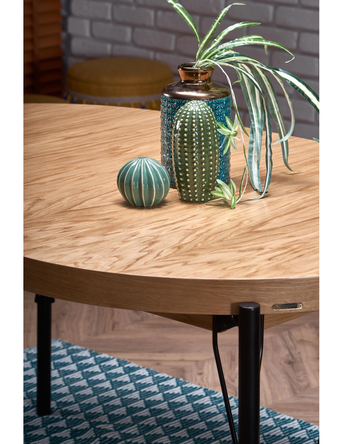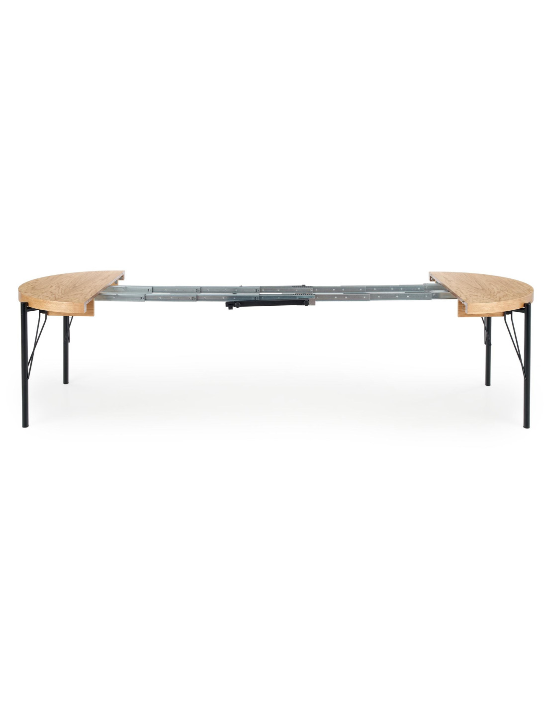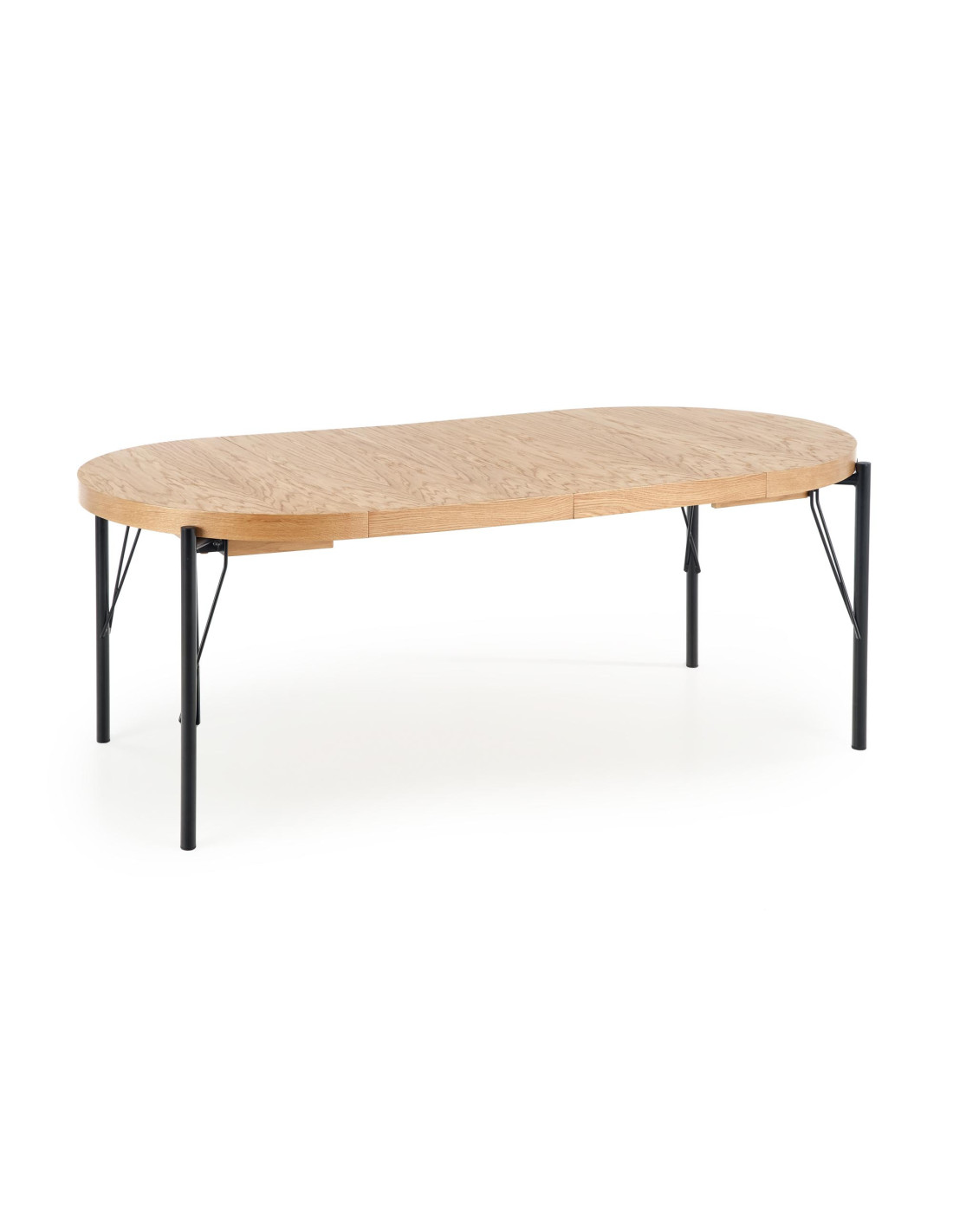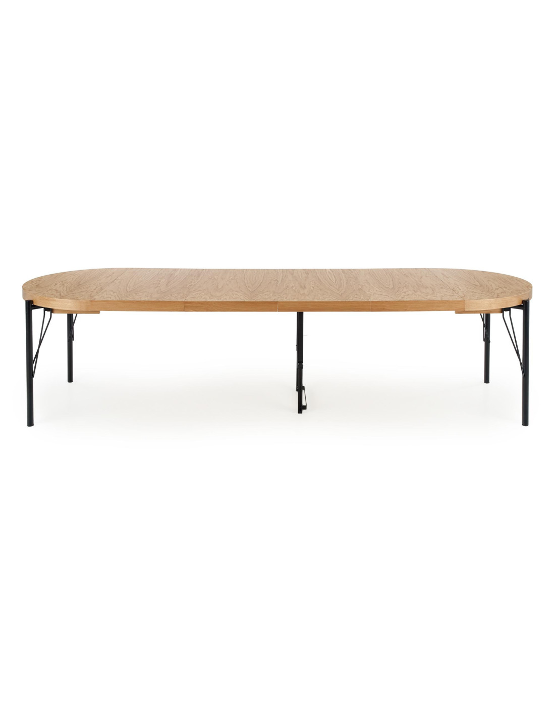 Wybierz duży stół rozkładany INFERNO, który harmonijnie łączy nowoczesność z industrialnym stylem! Owalny blat wykonany z MDF pokryty naturalną okleiną dębową w kolorze dąb naturalny, zestawiony z czarnymi, smukłymi nogami ze stali malowanej proszkowo, tworzy elegancką przestrzeń do wspólnych posiłków. Ten stół to doskonałe rozwiązanie zarówno na rodzinne obiady, jak i większe spotkania z przyjaciółmi.