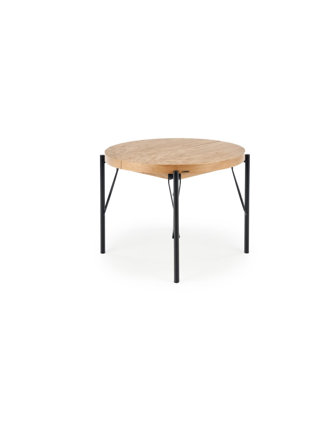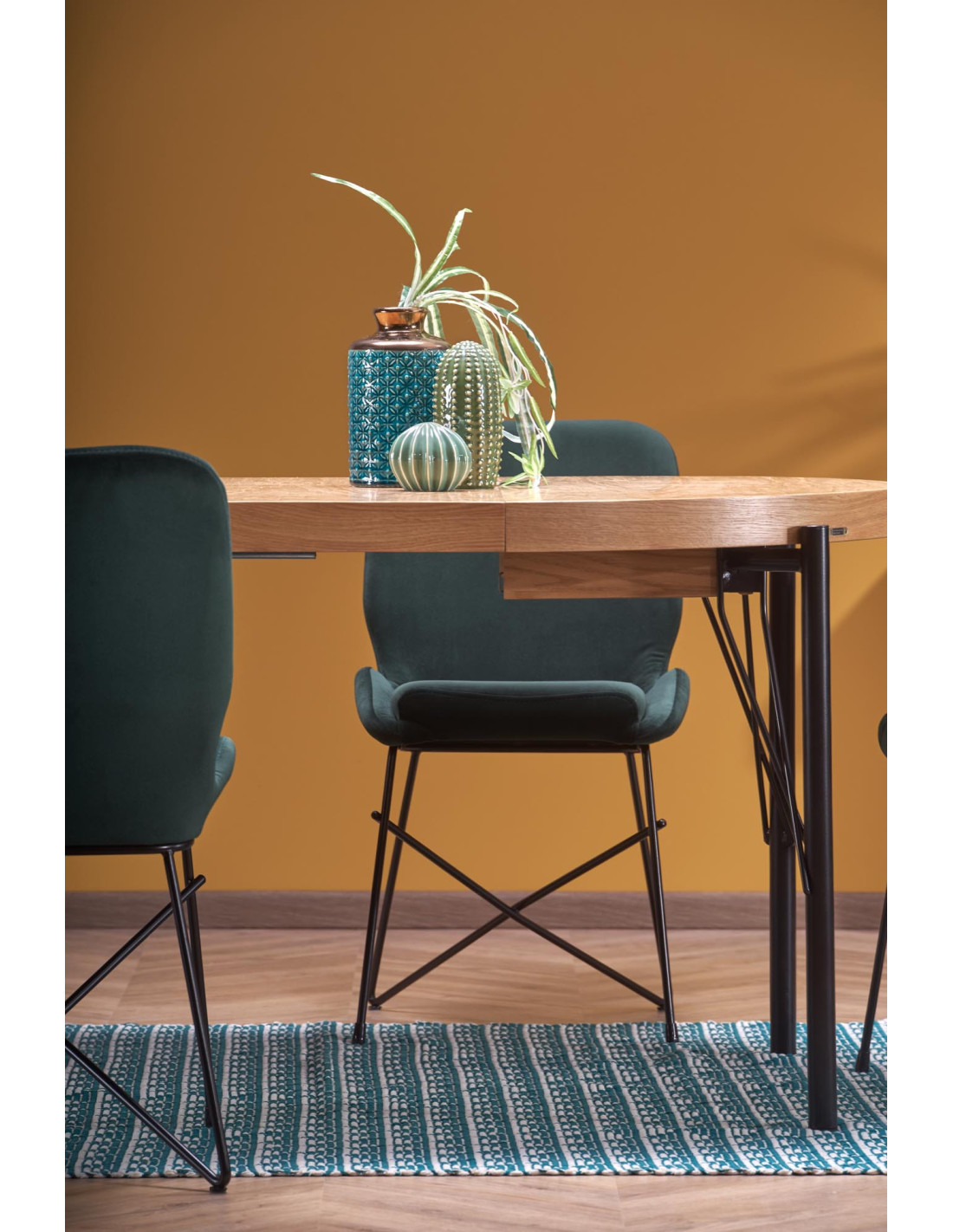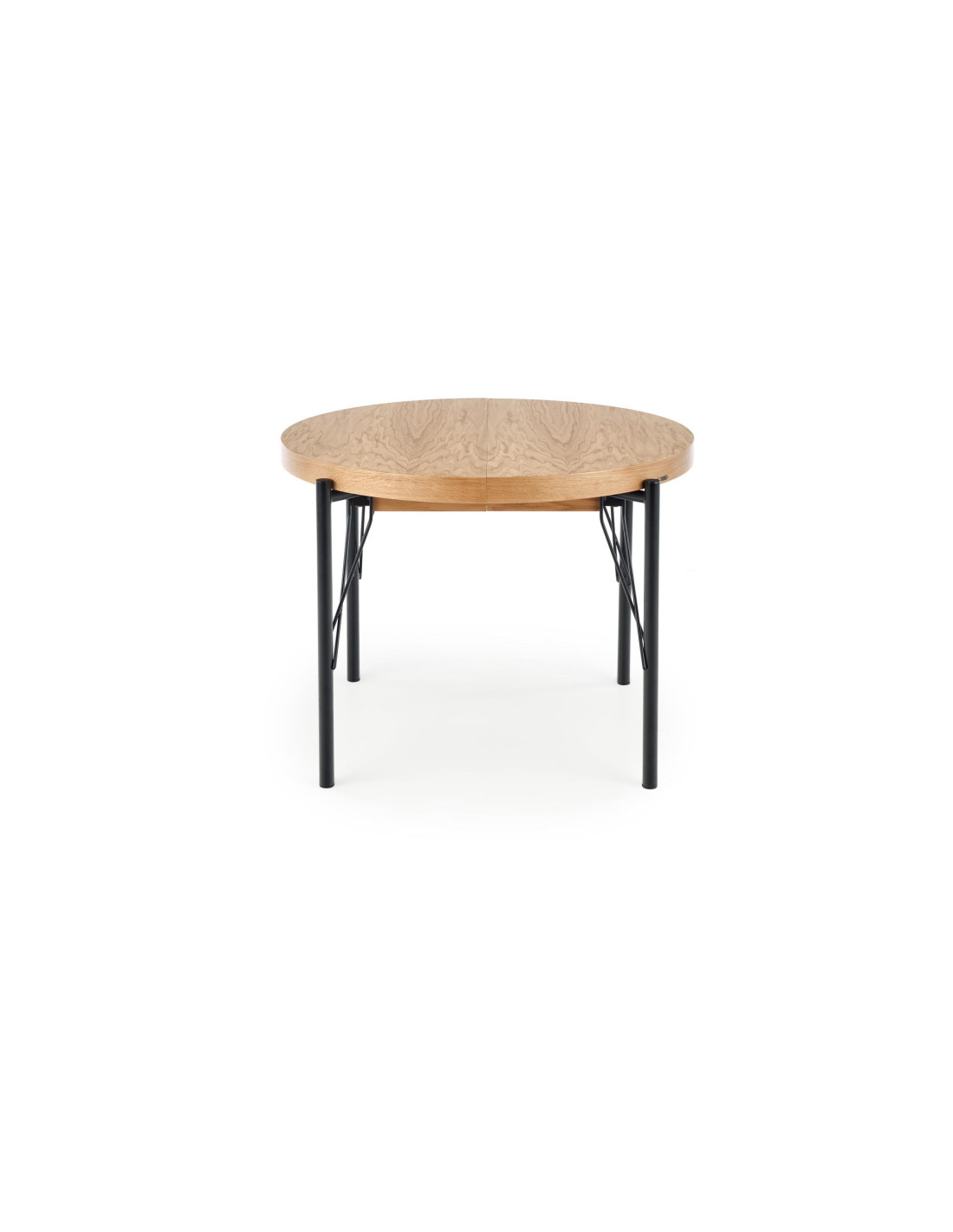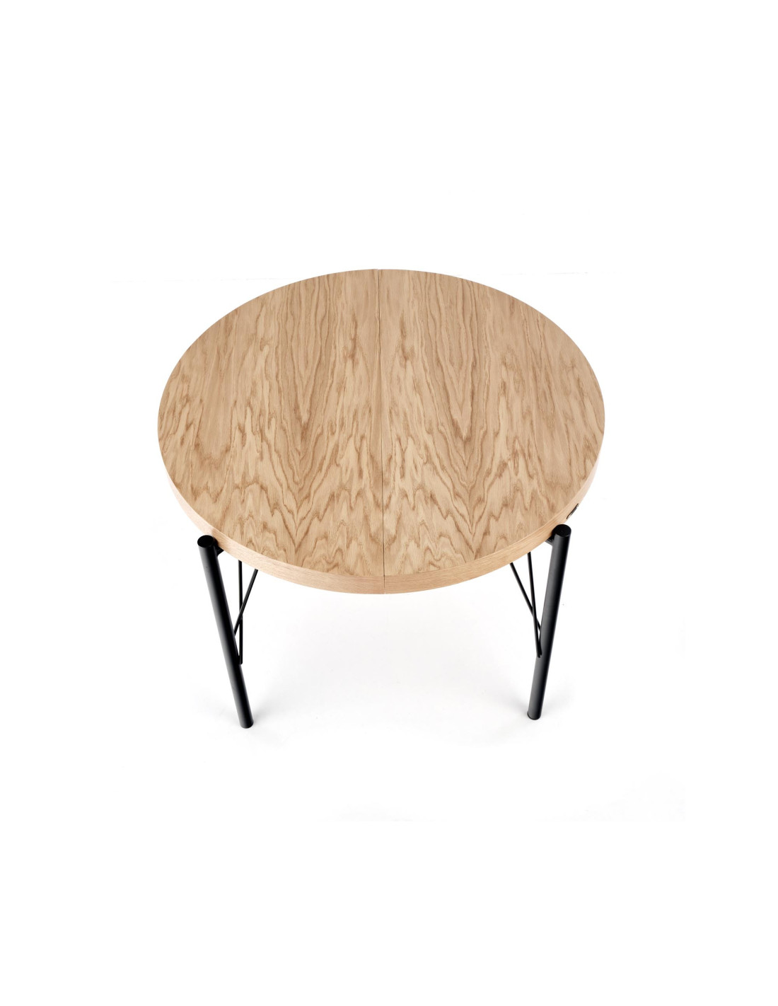 Wybierz duży stół rozkładany INFERNO, który harmonijnie łączy nowoczesność z industrialnym stylem! Owalny blat wykonany z MDF pokryty naturalną okleiną dębową w kolorze dąb naturalny, zestawiony z czarnymi, smukłymi nogami ze stali malowanej proszkowo, tworzy elegancką przestrzeń do wspólnych posiłków. Ten stół to doskonałe rozwiązanie zarówno na rodzinne obiady, jak i większe spotkania z przyjaciółmi.