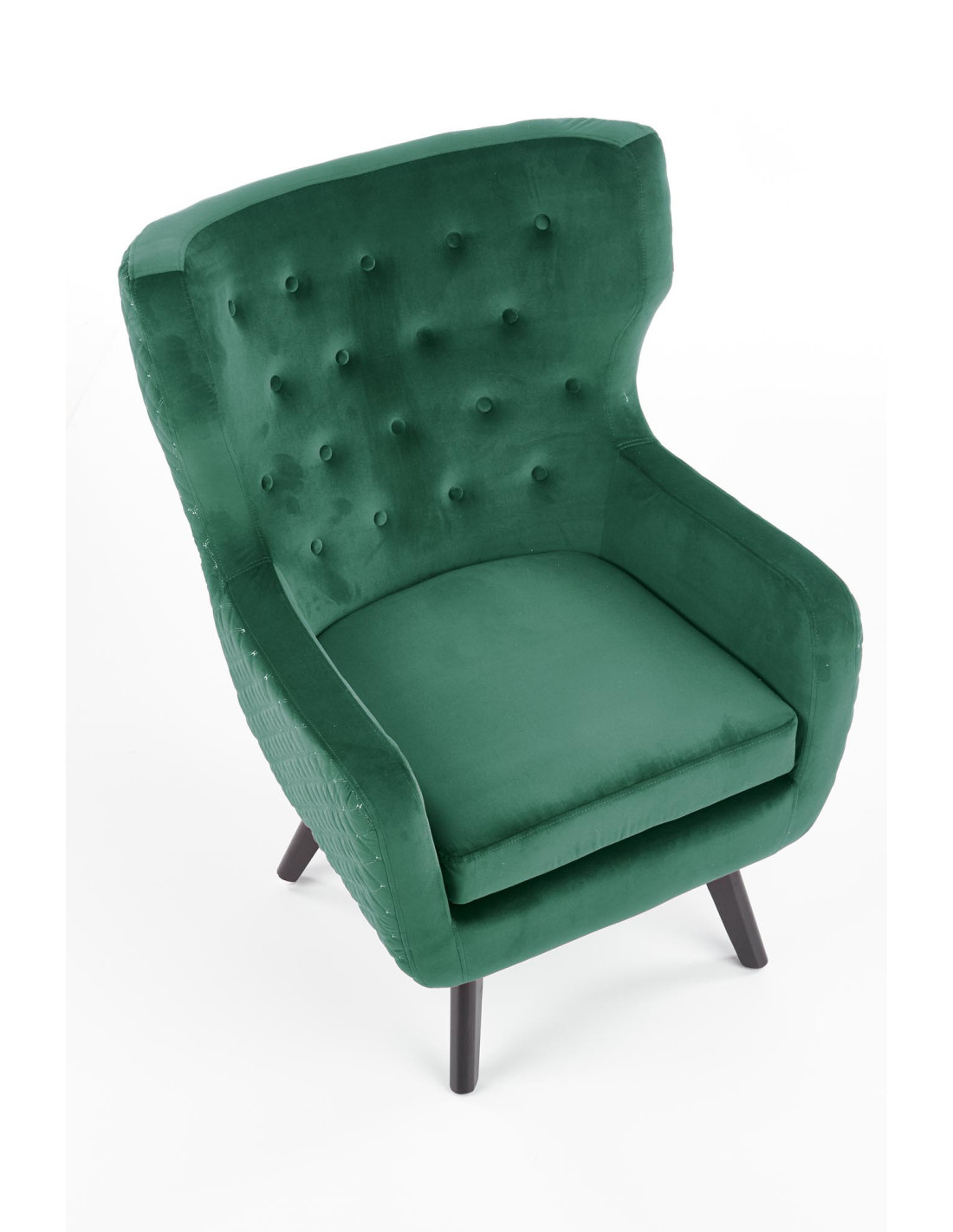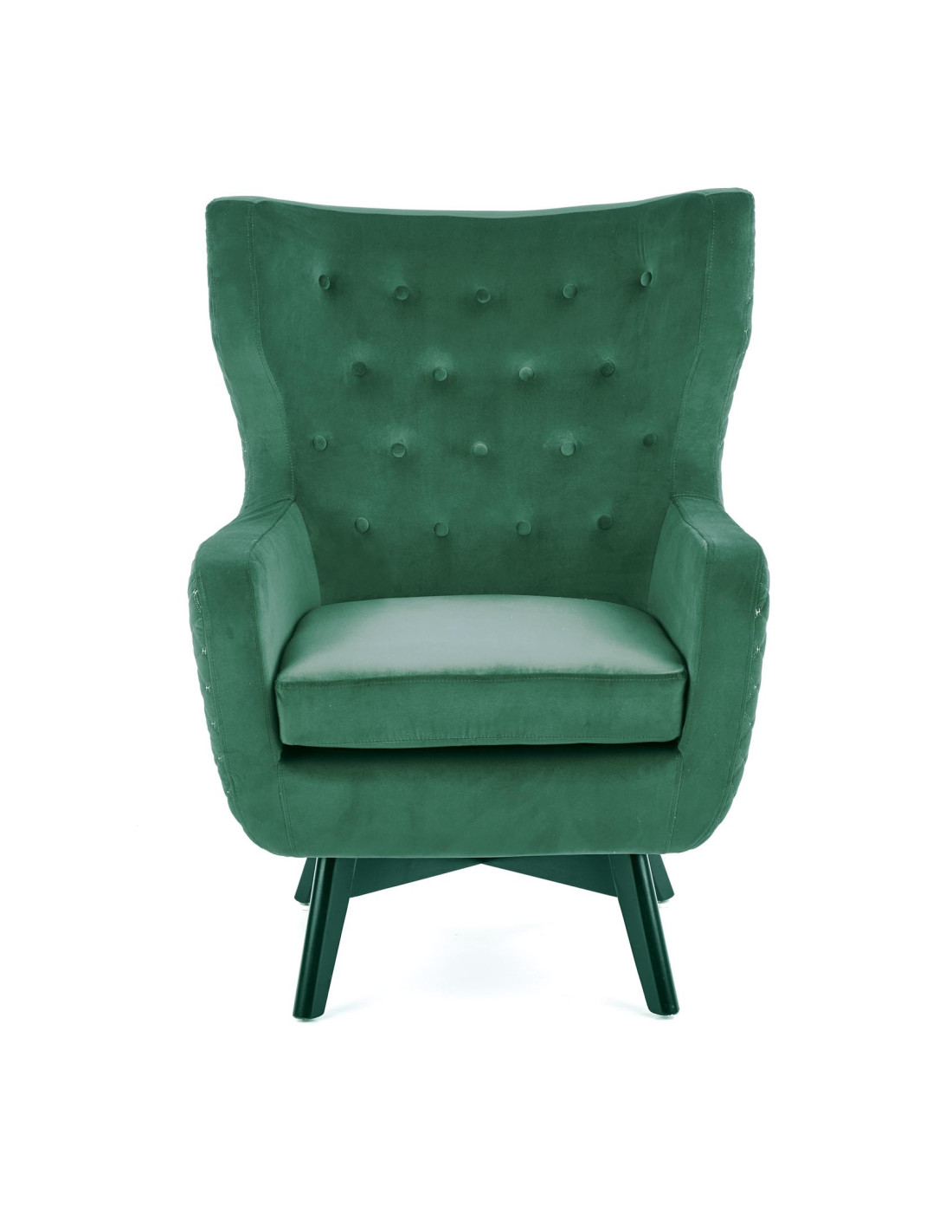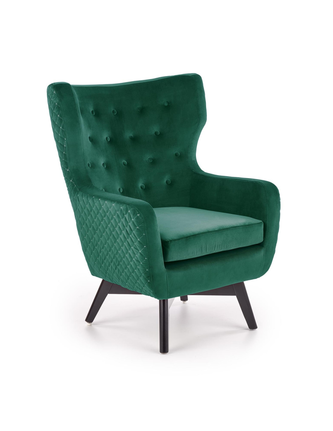 Przedstawiamy Ci fotel wypoczynkowy MARVEL, który harmonijnie łączy luksusowy design z wyjątkowym komfortem. Jego wysokie oparcie, ozdobione charakterystycznym pikowaniem w kształcie guzików, oraz wyprofilowane boczne oparcia, zapewniają doskonałe wsparcie dla pleców podczas relaksu. Aksamitna tapicerka w ciemnozielonym odcieniu nadaje mu elegancji, a lekko rozchylone nogi z czarnego drewna dodają całości nowoczesnego charakteru.