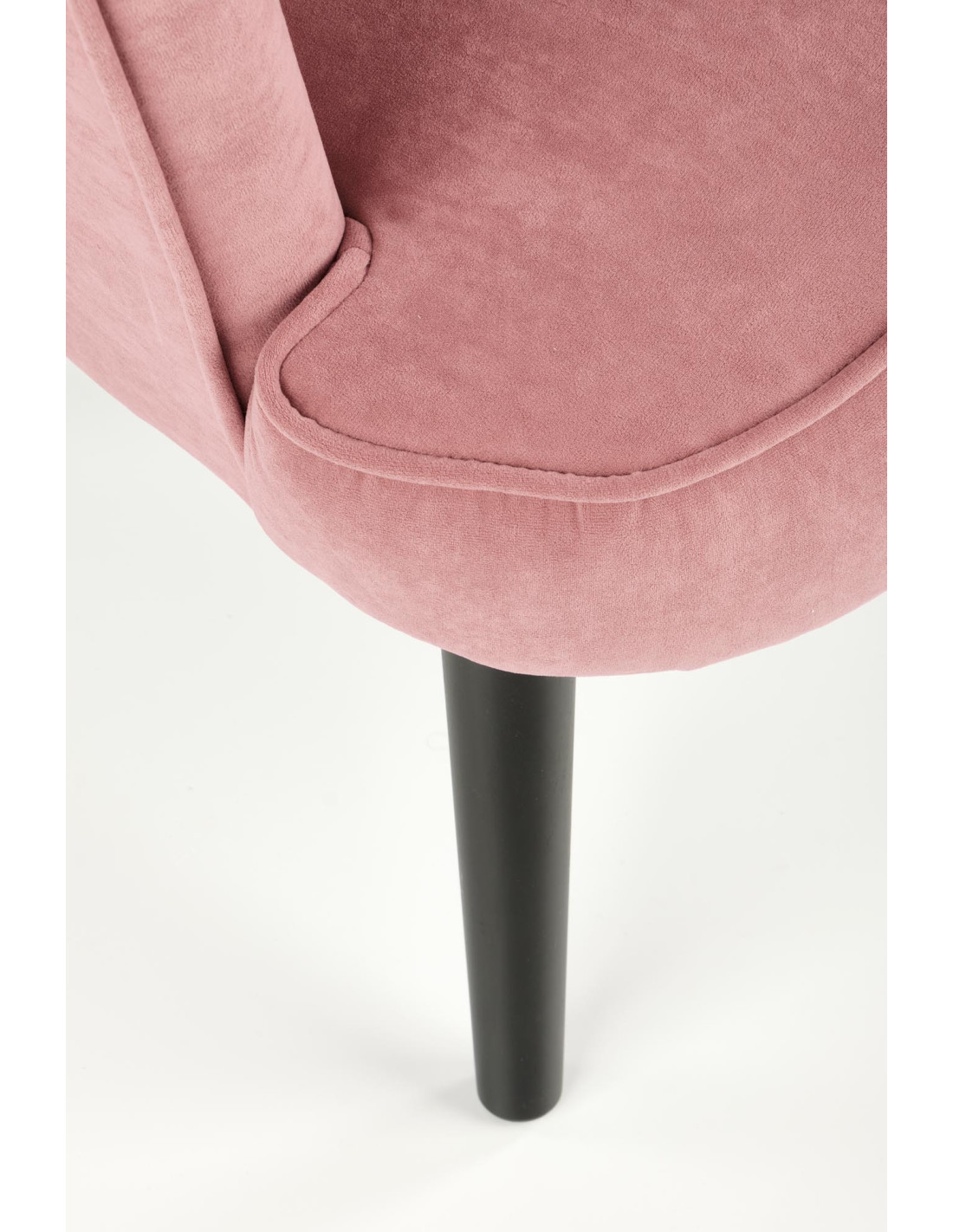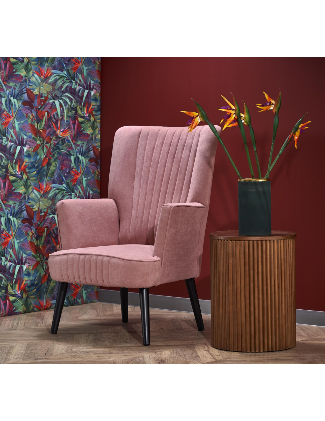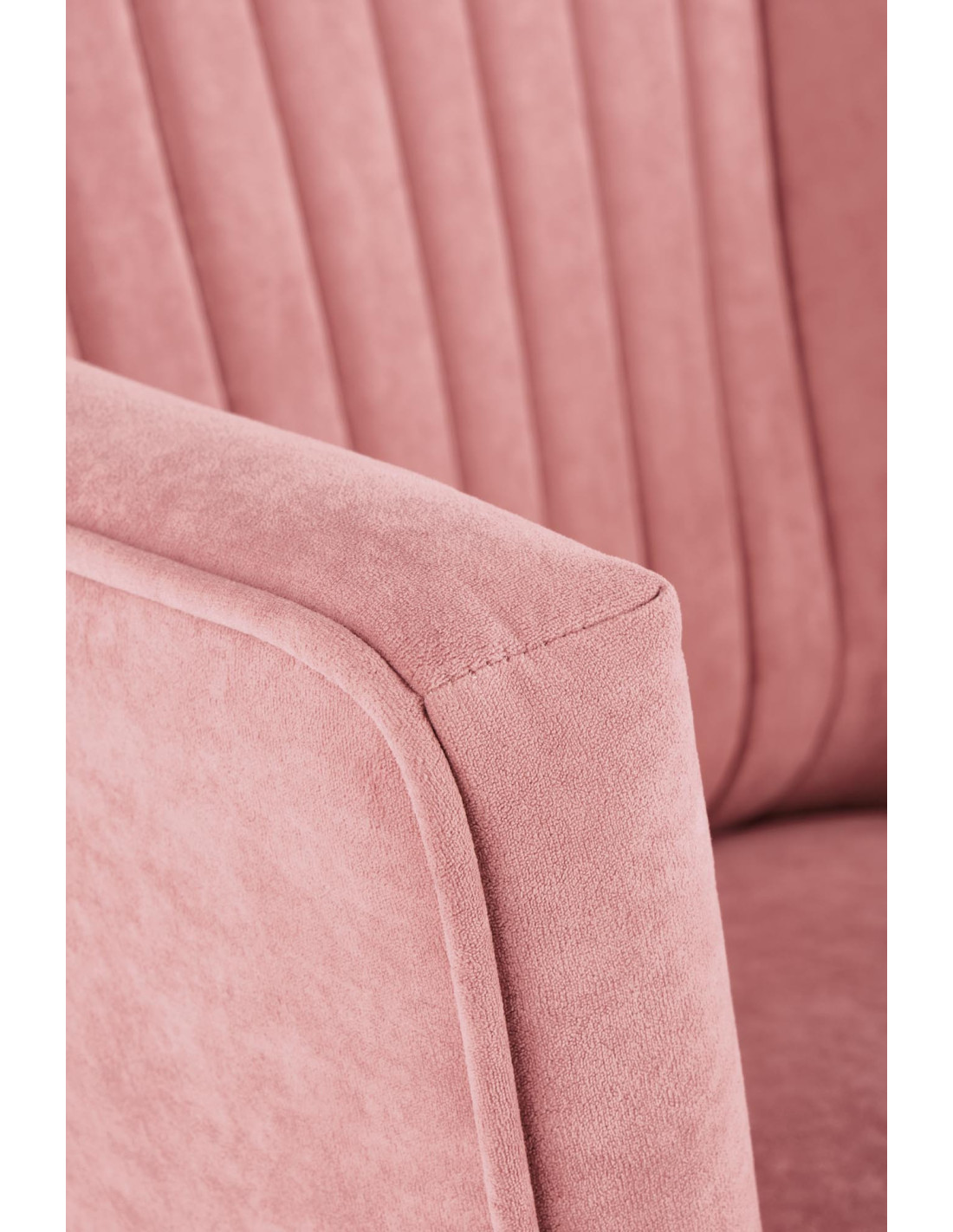 Ciesz się nowym fotelem wypoczynkowym DELGADO, który wprowadza do Twojego wnętrza elegancję i komfort. Jego klasyczny kształt z wysokim oparciem oraz wygodnymi podłokietnikami sprawia, że każdy moment spędzony w tym fotelu to prawdziwa przyjemność. Wykonanie z welwetu o pięknym różowym kolorze, ozdobione pionowymi przeszyciami, nadaje mu wyjątkowego charakteru, a zaokrąglone krawędzie oraz ciemne, drewniane nogi dodają mu klasy.