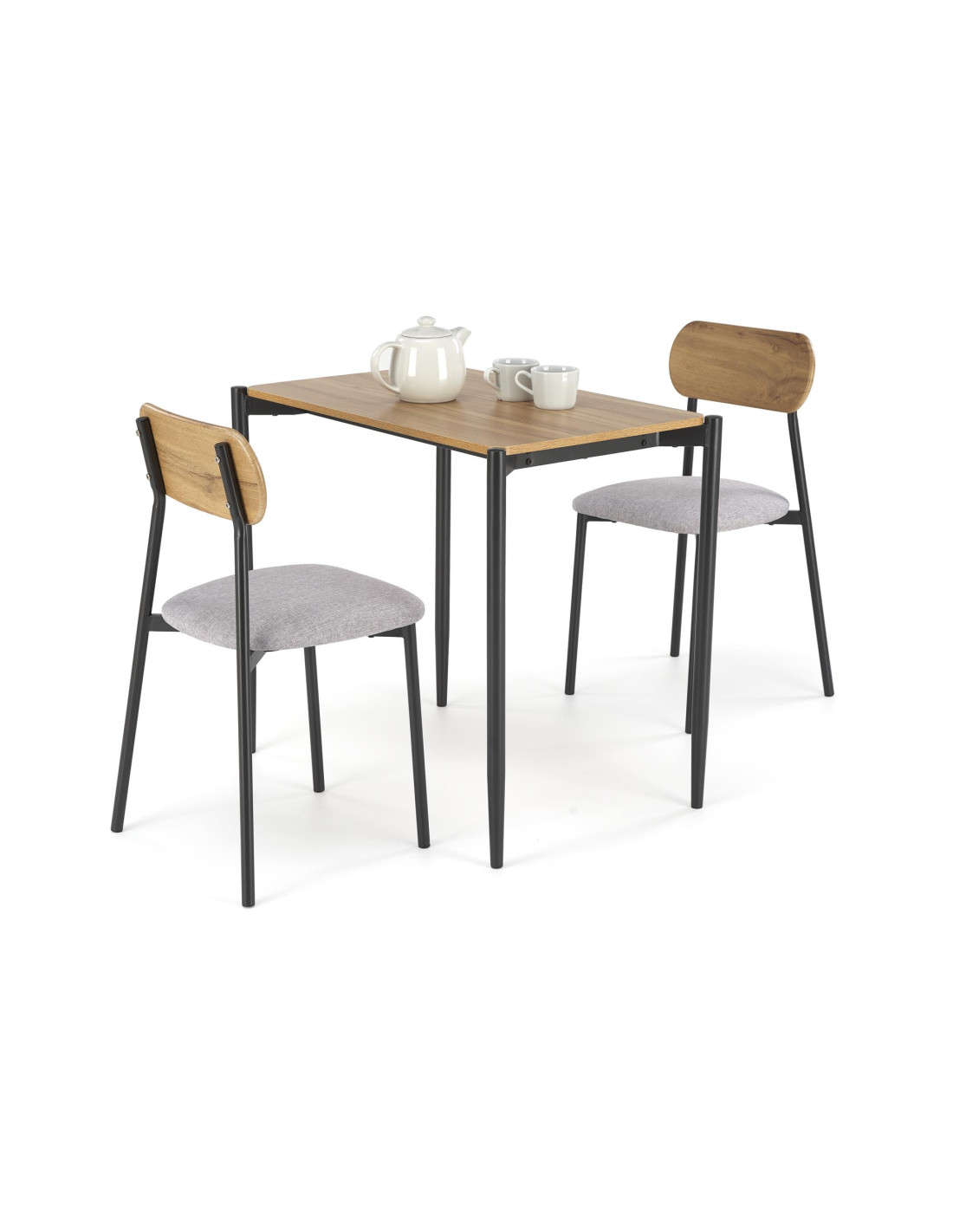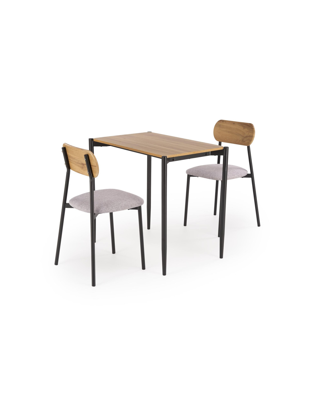 Ciesz się wyjątkowym designem zestawu NANDO, który łączy w sobie nowoczesny minimalizm z industrialnymi akcentami. Stół z prostokątnym blatem wykonanym z płyty meblowej okleinowanej w naturalnym kolorze drewna oraz czarnymi, metalowymi nogami sprawia, że jest to idealny wybór do każdego wnętrza. Dwa krzesła z popielatym siedziskiem i drewnianymi oparciami w naturalnym odcieniu doskonale uzupełniają całość, tworząc harmonijną przestrzeń.